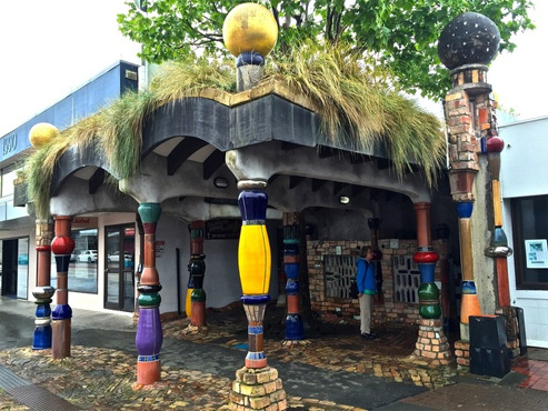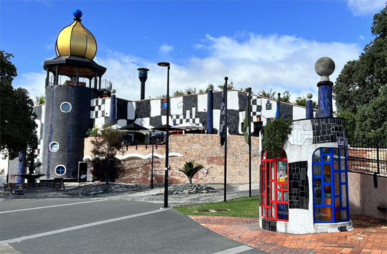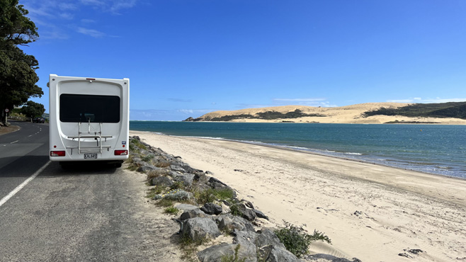 Wir spazieren durch den hübschen und untouristischen Ort Russel und queren dann mit der Autofähre das Waikare Inlet. Die Fähre benötigt für die 800 Meter weite Fahrt 10 Minuten und erspart uns eine Stunde Fahrzeit. Kaum irgendwo sind öffentliche Toiletten ein Touristenziel, aber jene von Kawakawa schon, weil sie Hundertwassers Werk sind. Er hat sie als Geschenk an seine Wahlheimat der Stadt spendiert und sogar von der Umfahrungsstraße ist der Weg ausgeschildert. In Kerikeri spazieren wir durch das Ensemble alter, gut restaurierter Häuser und machen uns dabei Gedanken über den weiteren Verlauf unserer Reise. Langsam wird es Zeit, nach Auckland umzukehren. Eigentlich wollten wir noch das weiter im Norden gelegene Gumdigger-Museum ansehen, das zeigt, wie früher aus dem Harz Jahrtausende alter, ausgegrabener Kauri-Baumstämme Gummi gewonnen wurde, aber leider ist der Highway 1 gesperrt und der Umweg wäre enorm, andererseits sind wir eh schon ein wenig reisemüde. Wir beginnen also mit dem Rückweg. Dazu geht es zunächst nach Westen, wo sich der Hokianga Harbour (kein Hafen, sondern ein Meeresarm) in die Tasmanische See öffnet. Die Mündung ist eng und von unserer Seite bietet sich ein spektakulärer Blick auf den Meeresarm und die gegenüber sich auftürmenden Sanddünen. Wir übernachten wieder sehr schön auf einem Platz am Ende eines Landzipfels hoch über dem Meer. Km 187/4.284.
