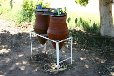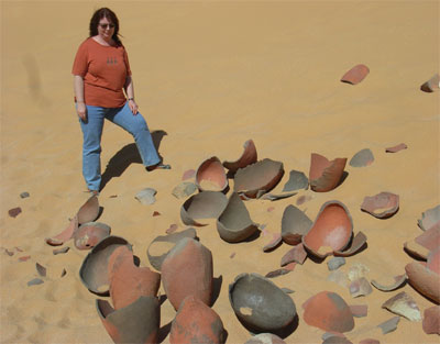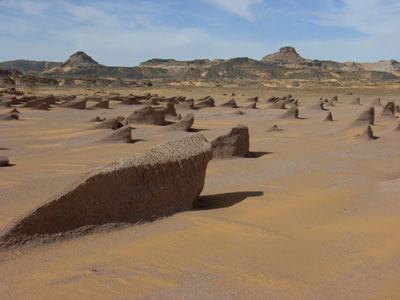 13, Abu Ballas Weiter geht es Richtung Südwesten durch wunderschöne Saharalandschaften, zunächst entlang eines Felsabbruchs, vorbei an Kegelbergen, dann wieder durch weite Sandebenen. An der Gedenktafel an Samir Lama (N24 26.453 E28 32.934) machen wir kurz Rast. In Abu Ballas wurden einst am Fuß eines Kegelberges zahlreiche 5- bis 6.000 Jahre alte Tonkrüge gefunden, Gefäße eines Wasserdepots. Heute ist kein einziger Krug mehr ganz; nur mehr Scherben zeugen von diesem Fund. Vor zehn Jahren sollen noch komplette Gefäße vorhanden gewesen sein. Mud Pan nennt sich ein Areal mit hunderten haifischflossenförmigen Sandsteinfelsen, die aus einem ausgetrockneten See entstanden sein sollen, und das wir am Nachmittag erreichen (N24 15.021 E27 28.165). Kurz bevor wir unser Nachtlager aufschlagen, verstopft sich unser Dieselvorfilter von einer Sekunde auf die andere. Während ich das Ding wechsle, entsteht eine Diskussion über dessen Notwendigkeit, Sinnhaftigkeit oder sogar Unsinn. Unser Führer Mahmoud bietet an, wieder für alle zu kochen, was wir gerne annehmen, hat er doch schon zweimal aus einfachsten Zutaten leckere Gerichte gezaubert. Weil es sehr windig ist, kocht er zwischen Treibstoffkanistern als Windschutz. Das sieht sehr gefährlich aus, ist es aber nicht, denn alle unsere Fahrzeuge haben Dieselmotoren und in keinem Kanister ist Benzin drin. Heute gibt es gebacken Karfiol, der uns allen sehr gut schmeckt. Km 319/4.850.