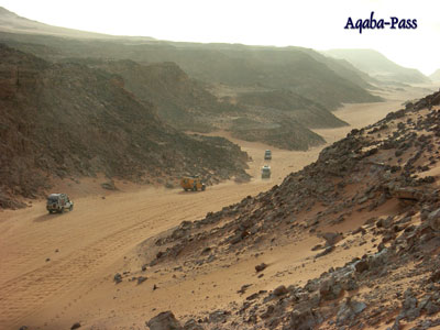 14, Gilf Kebir Endlich ist das Gilf Kebir in Sicht! Zugegebenermaßen sieht das Gebirgsplateau aus der Ferne nicht sehr beeindruckend aus, ein schmales dunkles Band am Horizont. Wir kommen näher und fahren an der Ostseite seines südlichen Anteils nach Norden um in einem großen Bogen in die Spalte zwischen Nord- und Südteil zu gelangen. Die Landschaft ist unbeschreiblich toll! Obwohl es immer wieder sehr sandig ist, ist die Strecke sehr einfach zu befahren. Mahmoud kennt sich sehr gut aus hier und umfährt mit großer Sicherheit Hindernisse wie Weichsand oder schwer passierbare Dünen. Schließlich gelangen wir auf das Plateau selbst, das sich ca. 150 Meter über die Wüste rundum erhebt, und fahren über den Aquaba-Pass, eine eindruckvolle Schlucht, auf die Westseite des Gilfs hinab. Die Schlucht eignet sich als Nachtplatz, denn es halbwegs windstill. Wir haben wieder viel Spaß mit unserem Führer. Auch unser Militäroffizier ist ein wenig aufgetaut. Hat er die ersten Tage kein Wort gesprochen und praktisch Tag und Nacht geschlafen, so gelangt heute erstmals ein Lächeln auf seine Lippen. Er hat jedenfalls sichtbar keine Freude an seinem Kommando. Ganz anders Mahmoud, dem es wie uns großen Spaß macht, durch die Wüste zu fahren. Am Abend setzt sich die Serie der Pannen mit unseren elektronischen Geräten fort: Unsere kleine Digitalkamera gibt ihren Geist auf. Vermutlich blockiert ein Sandkorn das Zoomobjektiv, so dass sich das Gerät nach dem Einschalten sofort wieder ausschaltet. Km 287/5.137. |