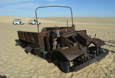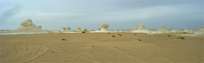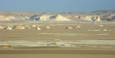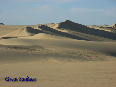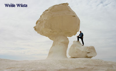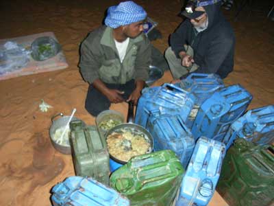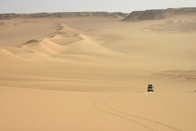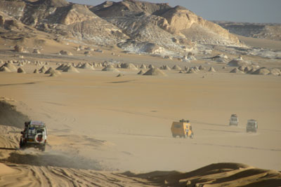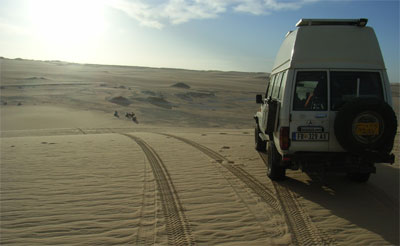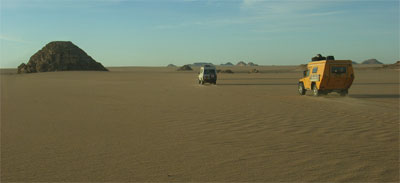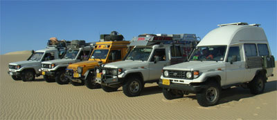 Auf Ägyptischer Seite ist alles sehr viel komplizierter und bürokratischer. Man darf schließlich nicht vergessen, dass die Ägypter das Papier erfunden haben! Zuerst füllen wir ein Formular mit unseren Daten aus, dann müssen wir Geld wechseln. Da heute Freitag ist und die Bank geschlossen hat, tauscht man auf der Straße. Der Mann, der uns das Geld wechselt, bietet sich auch als Helfer durch die Grenzformalitäten an. Wir handeln einen Preis für seine Hilfe von 50 LE (6,67 EUR) je Fahrzeug aus, eine Ausgabe, die sich jedenfalls lohnt, denn er kennt die vielen Wege, die in einer bestimmten Reihenfolge zu absolvieren sind: Passkontrolle bei der Polizei, Blick ins Auto durch den Zoll, Zollstempel, Registrierung der Fahrgestell- und Motornummer, Kopierbüro, Carnetbüro, Amtskasse, neuerlich Carnetbüro, Versicherungsbüre, Traffic-office, nochmals Carnetbüro, neuerlich Traffic-office, wo uns die Nummernschilder und die Fahrbewilligungen ausgehändigt werden. Am längsten dauert bei uns die Sache mit den Fahrgestell- und Motornummern. Die Nummern werden nämlich von den Stellen, wo sie ins Fahrgestell bzw. in den Motorblock eingestanzt sind, auf ein Formular gerubbelt. Das geht normal ganz schnell, wenn bekannt ist, wo die Nummern sind. Da wir auf die Sache natürlich vorbereitet sind, wissen wir, wo bei unseren Landcruisern die Fahrgestellnummern sind, und dass die Motornummern nicht zugänglich sind. Das glaubt man uns aber nicht und ewig lange suchen der Rubbler und ein Ingenieur vergebens nach den Motornummern. Endlich kommt Plan B: Die Motoren werden verplombt. Bei Ingrid und Gerds Auto ist es gerade anders rum: Die Motornummer ist rasch gefunden, die Fahrgestellnummer unauffindbar. Hier werden gemäß Plan B die letzten Ziffern der Fahrgestellnummer in die B-Säule gestanzt. Ebenfalls sehr lange dauert die Sache mit den Carnets, weil in dem allgemeinen Durcheinander auf den Schreibtischen Papiere verschiedener Fahrzeuge zusammengeheftet werden und ich gegen Ende der Prozedur nochmals an den Start muss. Alles in allem dauert der Grenzübertritt, tunesische Seite miteingerechnet, fünfeinhalb Stunden und kostet 1.260 LE, 168 EUR. Ich lasse mir nun noch von einem Beamten unsere Autonummern in unserer Schrift aufschreiben, schicke sie später unserem Führer ins Gilf per SMS, damit die Bewilligung für das Befahren der libyschen Wüste fertig sind, wenn wir morgen in Siwa eintreffen. Es wird bereits dunkel, als wir von der Grenze wegfahren. Sehr beeindruckend ist der Blick von der Hochebene hinunter auf den Grenzort Solloum, sehr steil und kurvig die Straße. Etwas außerhalb von Solloum wollen wir übernachten. Doch wir haben auf die ägyptische Polizei vergessen, die sich so um uns sorgt, dass sie uns zum Übernachten direkt am Posten bei der Stadtausfahrt in Solloum "einlädt". Km 206/3.071. Samstag, 1. Dezember 7, Tag 9, SiwaGleich in der Früh kündigt uns die Polizei ihre Begleitung an. Bis Marsa Matruh oder gar bis Siwa? Alles unklar. Als wir dann um 7 Uhr starten, ist ohnehin wieder alles anders und wir können alleine fahren. Zwischen Matruh und Siwa kommt uns aber ein Polizeifahrzeug entgegen, das wendet und uns über mehr als 100 Kilometer begleitet. Heute ist es beinahe wolkenlos und die Luft ist sehr klar. Die Landschaft ist bis Siwa total abwechslungslos, einfach nur eben. Erst zu Mittag, ganz kurz vor Siwa, als wir in die Depression hinunterfahren, wird es anders, direkt spektakulär: Zeugen- und Tafelberge säumen den Geländeabbruch. Hier wird auch in großen Mengen Kalkstein abgebaut, Muschelzeichnungen in den herumliegenden Steinen bezeugen den fossilen Ursprung. Innerhalb der Depression erheben sich aus einem Gemisch von braunen Häusern und grünen Palmenhainen mehrere Berge. Sofort finden wir das Hotel Arouz, das als Treffpunkt mit unserem Führer für die nächsten Tage vereinbart ist. Da er noch nicht da ist, rufen wir ihn an und innerhalb weniger Minuten fährt er vor, mit einem weißen Buschtaxi versteht sich. Hat sogar dasselbe Baujahr wie unsere! Unser Führer heißt Mahmoud und wir finden ihn sofort sehr sympathisch. Beim Mittagessen besprechen wir unsere weiteren Pläne. Wir besichtigen die sehr eindrucksvolle und auf einem Hügel gelegene Altstadt, von der man einen recht schönen Blick auf die Oase hat. Der Orakeltempel hingegen ist wenig spektakulär. Wir besuchen auch das Kleopatrabad, eine warme Quelle, in der man schwimmen kann. Als wir die Autos aufgetankt, Luft abgelassen und den vorgeschriebenen Militäroffizier aufgenommen haben, ist es schon dunkel und wir fahren nur ein kurzes Stück hinaus in die Sandwüste, wo wir campieren. Mahmoud kocht Gemüsesuppe, die ausgezeichnet schmeckt, und serviert Obst als Nachtisch. Besonders schmecken uns die Guavas, grüne birnenförmige Früchte. Diesel in Ägypten 0,75 LE = 0,10 EUR. Km 505/3.576. Sonntag, 2. Dezember 7, Tag 10, Great SandseaNun geht es nach Süden, hinein in die Große Sandsee. Wir fühlen uns sofort wieder "daheim" und genießen die Fahrt zwischen den Nord-Süd verlaufenden Dünenzügen. Es sind mehrere sehr steile und teils auch lange Dünenabfahrten zu bewältigen. Außer der tollen Landschaft gibt es nicht viel zu sehen, nur die "russische Quelle", die wir zu Mittag erreichen, und das Wrack eines LKW aus dem zweiten Weltkrieg. Die abgestürzte Messerschmidt nahe der russischen Quelle finden wir nicht an den von einem Bekannten erhaltenen Koordinaten. Kurz vor der weißen Wüste übernachten wir in einer Dünensenke. Ganzen Tag war es heute klar, auch in der Nacht verdeckt keine Wolke den Sternenhimmel. Leider müssen wir heute feststellen, dass unser Satellitentelefon kaputt ist. Wir können daher nicht mehr täglich eine Nachricht auf den Ticker der Homepage schicken. Das geht nur mehr, wo ein GSM-Netz verfügbar ist, mit unserem normalen Handy, also in den größeren Oasen, nicht jedoch während unseres Ausflugs ins Gilf Kebir. Ein weiters Problem sorgt mich: Unser Notebook lässt s