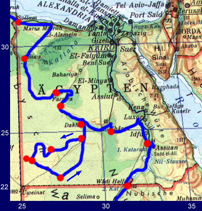 in Assuan Um 5.15 bimmelt der Wecker, es ist oberschweinekalt und wir starten zum ersten Mal unsere Standheizung. Doch die funktioniert nicht und schaltet sich gleich wieder ab. Wir fahren ohne Frühstück weg, das heißt: wollen wir. Geht aber nicht, denn unser Auto will nicht fahren. Jetzt ist uns auch alles klar: Der Diesel ist ausgeflockt. Wir lassen den Motor eine Weile am Stand laufen und dann geht's langsam. Als es um 6 Uhr dämmert, sind wir schon unterwegs. Auf der Straße Kharga-Luxor gibt es etwa fünf Polizeiposten, an jedem werden wir nach unserer Nationalität und nach der Anzahl der Personen im Auto gefragt, an manchen zudem nach unserem Ziel, das wir mit Luxor angeben. Ca. 40 Kilometer vor Luxor biegen wir auf die nilferne Straße nach Assuan ab und sollten hier freie Fahrt haben. Ohne Kontrollen und vor allem ohne Konvoi. Obwohl wir wider Erwarten an einer Kontrolle kurz vor dem Abzweig nach Edfu 20 Minuten warten müssen, sind wir um kurz nach 11 in Assuan. Unser erster Weg führt uns zum Campingplatz "Adams Home" (N24 10.153 E32 51.969), wo wir hoffen, dass uns der Besitzer sagen kann, wo die Nile Transportation Company und die Sudanesische Botschaft sind. Doch der Boss ist ausgeflogen, kommt erst am Nachmittag wieder. Wir fahren daher gleich über die Nilbrücke ins Zentrum von Assuan und finden sehr rasch die Fährgesellschaft (N24 05.948 E32 53.983, Tel. (02)0183160926). Herr Salah begrüßt mich freundlich und meint, es sei kein Problem, unsere Autos noch vor den Holidays zu verschiffen, auch wenn die anderen erst morgen kämen. Aber zuerst müssen wir die Visa für den Sudan besorgen. Die Botschaft ist schnell gefunden (N24 06.337 E32 54.177), doch hier gibt es schlechte Nachrichten: Der "Manager" ist auch on holiday und kommt erst am Samstag wieder. Da sollten wir in der Früh kommen und die Visaanträge ausfüllen, die dann nach Karthoum geschickt werden und in ein bis zwei Tagen genehmigt (oder auch nicht?) zurückkommen. Da hilft auch kein Rütteln. Ohne Manager geht das nicht. Also zurück zu Mr. Salah, mit dem ich nun Plan C entwickle: Die Autos werden am 22. auf einem eigenen Ponton verschifft (trotz holidays!), wir Passagiere fahren mit der Personenfähre am 24. Dezember. Er empfiehlt uns, die Visa in Kairo zu besorgen, denn wenn wir sie nicht in Assuan kriegen, ist wegen der holidays keine Zeit mehr, nach Kairo zu fliegen. Wir werden das morgen gemeinsam entscheiden. Am Nachmittag suchen wir noch wie verrückt nach einem Internetcafe und einem Elektronikgeschäft. Hier krieg ich endlich einen Card-Reader, doch der funktioniert nicht. Im zweiten Geschäft probiere ich mehrere Geräte aus, erst der dritte Card-Reader funktioniert. Nun kriegen wir endlich die Bilder von der Spiegelreflexkamera ins Notebook! Auf dem Weg zurück zum Auto ist es schon dunkel. Mehrfach werden wir von aufdringlichen Straßenhändlern angesprochen, deren T-Shirts, Wasserpfeifen, Pharaonenstatuen etc. zu kaufen. Ein Papyrushändler ist besonders aufdringlich, kommt mir sehr nahe und öffnet unter den Papyrusblättern, die er in der einen Hand hält, den Reissverschluß meiner Gürteltasche. Als ich das merke, hau ich ihm eine runter, worauf er so verdutzt ist, dass er nicht einmal wegläuft, sondern einfach stehenbleibt. Gott sei Dank fehlt nichts aus der Tasche. Zum Übernachten ziehen wir die Pampas dem Campingplatz vor. Km 477/6.760. |