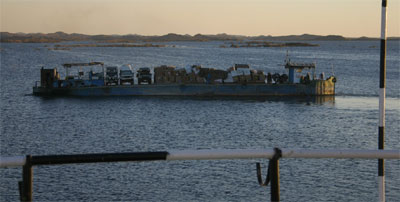 Dienstag, 25. Dezember 7, Tag 33, Wadi Halfa Obwohl die Betten ziemlich kurz sind, schlafen wir gar nicht so schlecht, wachen aber erfreulicherweise rechtzeitig auf, bevor wir Abu Simbel passieren. Wir sind (wieder) tief beeindruckt. Kurze Zeit später überholen wir die zwei Pontons mit den neun Fahrzeugen, die bereits am Sonntag in Assuan abgefahren sind. |