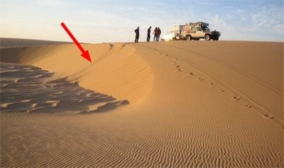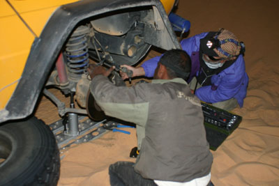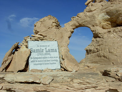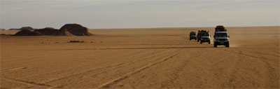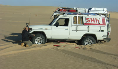 16, Flugplatz in der Wüste Nach einem Motorölwechsel bei Mahmouds Toyota - er wechselt alle 1.000 Kilometer! - geht es nun also langsam zurück Richtung Dakhla. Dazu bieten sich zwei Wege an, der eine führt um die Südspitze des Gilf Kebir herum, vorbei an einem der Treibstoffdepots unseres Führers Mahmoud. Da wir durch unsere nun stark verkürzte Route keinen Diesel aus dem Depot benötigen, fahren wir den anderen, kürzeren, durch das Wadi Wasa, praktisch durch das Gilf hindurch. Da auf der Zufahrt ins Wadi Wasa möglicherweise noch Minen liegen, fahren wir streng hintereinander in bereits vorhandenen Spuren, die sich hier zu einer Piste gebündelt haben. Mittagsrast halten wir an der Show-Cave, einer Höhle mit Malereien von Rindern. Nachdem wir das Gilf hinter uns gelassen haben, geht es nun Richtung Ost-Süd-Ost. In großen Mengen liegen Benzinkanister aus dem 2. Weltkrieg verstreut herum. Wir passieren Eight Bells, einen Flugplatz der Engländer, benannt nach acht glockenförmigen Hügeln in der Nähe. Auch nach mehr als 60 Jahren ist noch immer der aus sandgefüllten Benzinkanistern ausgelegte Schriftzug "8 BELLS" und ein großer Richtungspfeil sichtbar. In nur gut 30 Kilometer von der sudanesischen Grenze schlagen wir unser Nachtlager auf. Doch kurz zuvor gibt es noch Aufregung: Wie oft ist Mahmoud weit vorausgefahren und außer Sicht. Wir folgen seiner Spur, die er deutlich hinterlassen hat. An einer Stelle komme ich mit meinem Wagen dem Kamm einer Sicheldüne recht nahe, kann aber mein Fahrzeug noch rechtzeitig weglenken, bevor ich zu nahe an die weiche Stelle der Düne komme. Gerd gelingt das nicht, er entscheidet sich für die Abfahrt über die Steilfläche der Düne. Helmut, der als Nächster kommt, leitet eine Vollbremsung ein und bleibt im weichen Sand oben auf der Düne stecken. Er ruft per Funk um Hilfe und wir haben ihn im Nu herausgeschoben. Erst dann sehen wir an den Spuren von Gerds Wagen, welch abenteuerliches Manöver er hinter sich hat. Auch wenn die Düne sehr klein ist, hat nicht viel gefehlt, und das Auto wäre zum LIegen gekommen. Ingrid und Gerd zittern noch die Knie. Sie haben großes Glück gehabt. Erst auf der Weiterfahrt zum nahen Nachtplatz, wo bereits Mahmoud und Peter warten, merkt Gerd, dass sein Wagen komische Geräusche von sich gibt. Nach einiger Zeit findet Mahmoud die vermeintliche Ursache: Der Querlenker ist verbogen. Es gelingt, das Teil mit mehreren Wagenhebern auszubiegen, aber das Geräusch ist noch immer vorhanden. Der heftige Aufschlag nach der Dünchenabfahrt hat den Sitz einer Spiralfeder verschoben, die nun irgendwo scheuert. Die Reparatur dauert lange, aber nach gut zwei Stunden feiern wir bei einer Portion "Katastrophenfutter" deren Gelingen. Km 348/5.563. |