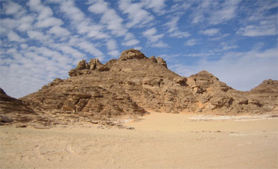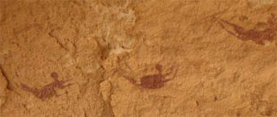 15, Schwimmer in der Wüste Nach kurzer Fahrt melden Ingrid und Gerd einen Patschen über Funk. Der Reifen sieht ziemlich übel aus, Gerd ist anscheinend schon längere Zeit mit dem Platten gefahren, ohne es zu bemerken. An Flicken ist nicht mehr zu denken, nur mehr an Wegwerfen. Während des Reifenwechselns bemerken wir, dass ein weiterer Reifen am selben Auto Druck verloren hat. Da der Mercedes nur ein Reserverad mithat und die Landcruiser-Felgen nicht passen, breitet sich Unruhe in der Gruppe aus und manche möchten auf der Stelle umdrehen, obwohl wir bei einer sofortigen Umkehr nach Dakhla noch ca. 700 Kilometer zu fahren hätten gegenüber ca. 800 Kilometern bei Weiterfahrt nach Plan. Mahmoud bestellt gleich zwei neue Reifen aus Kairo, die in drei Tagen in Dakhla sein sollten. Er versucht zu beruhigen: Den einen Reifen wechseln wir, den zweiten könnten wir reparieren, bei weiteren Patschen könnten wir einen Schlauch einziehen oder die Landcruiser-Reifen auf eine Merzedes-Felge ummontieren. Wir fahren also weiter ins Wadi Sura, um die berühmte Höhle der Schwimmer zu besichtigen. Auf dem Weg dort hin passieren wir Three Castles, das Mahmoud "Pebbles Island" nennt, wo noch Reste eines englischen Lagers aus dem 2. Weltkrieg zu sehen sind. Sugar Loafs nennen sich mehrere solitäre Felsformationen, die an den Zuckerhut von Rio erinnern. Im Wadi Sura machen wir Mittagsrast. Während Mahmoud kocht, besichtigen wir die beiden Höhlen, eigentlich sind es eher Felsüberhänge mit Felsmalereien. Die Schwimmer sind winzige Figürchen, die angeblich dokumentieren, dass hier vor tausenden von Jahren soviel Wasser war, dass die Menschen schwimmen konnten. Die Malereien sind schon sehr beeindruckend, aber dürftig im Vergleich zu dem, was noch vor einigen Jahrzehnten hier zu sehen war. Die Malereien haben sehr darunter gelitten, dass sie vielfach mit Wasser befeuchtet wurden, damit sie auf Fotos besseren Kontrast geben. Nach etwa zehn Kilometern erreichen wir die Foggini-Cave, eine erst 2002 entdeckte "Höhle", eigentlich wieder ein Felsüberhang, übersät von hunderten Darstellungen von Menschen, Tieren und Händen, vielleicht 5.000 Jahre title, teils in nie gesehener Detailtreue, begleitet von einigen wenigen Felsgravuren. Diese Fundstätte ist beeindruckender als alles, was wir an Felsmalereien in der Sahara bisher gesehen haben, sowohl quantitativ als auch qualitativ! Ich sitze da und kann mich gar nicht sattsehen. Wahnsinn! Der eine Reifen am Mercedes, den wir unter Beobachtung hatten, hat bis zum Abend nicht weiter Luft verloren. Km 77/5.215. |