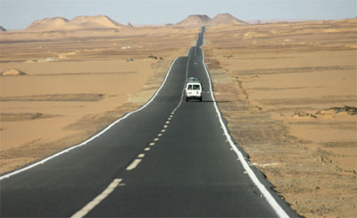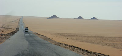 17, Selima Sand Sheet Von nun an geht es Richtung Nordosten, weiter auf den unendlichen Sandflächen des Selima-Sand-Sheet. Als wir zu Mittag die Asphaltstraße von East Uweinat nach Dakhla erreichen, hören wir ein zumindest zweistimmiges erleichtertes "Endlich". Susi und ich finden es sehr schade, dass der Ausflug ins Gilf Kebir schon aus ist. Es hätte noch viel zu entdecken gegeben. Da uns auch die bisher gesehenen Oasen sehr gefallen haben, ist ohnehin ein Wiederkommen vorprogrammiert. Wir haben übrigens seit Verlassen der Asphaltstraße vor 5 Tagen außer einer Reisegruppe keine Menschenseele getroffen und außer einem Fennek, einigen Schmetterlingen und mehreren Heuschrecken keine Tiere. Hier wächst nichts, es gibt keinen Grashalm, keinen Busch, keinen Baum, daher keine Kamele, keine Ziegen, nichts. Km 448/.6.011. |
