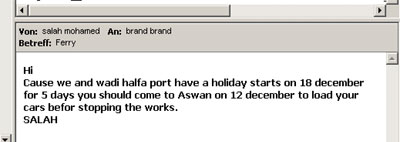 Abschied In der Früh ein Besuch auf der Botschaft: Keine Visa. Wir fahren nun zur Traffic Police (N24 05.020 E32 54.477, geöffnet Sa-Do 8.30-14), wo ich unser Auto abmelde (Eingang für uns auf der Rückseite des Gebäudes, man landet nicht an den Schaltern, sondern direkt an den Schreibtischen, Mr. Joseph ist zuständig). Ich erhalte eine Bescheinigung, mit der ich ohne Kennzeichen 2 Tage fahren darf, wegen der Holidays "maybe five". Unsere Freunde können sich nicht entschließen, diesen Schritt zu tun, ist doch damit der Weg zurück nach Europa vertan oder zumindest erschwert. Wir fahren zurück auf die Botschaft und sitzen mehrere Stunden im Wartezimmer. Wenn bis um 13 Uhr das erwartete Fax aus Khartoum nicht da ist, geht es sich für unsere Freunde nicht mehr aus, ihre Autos abzumelden, weil die Traffic Police um 14 Uhr schließt. Auch wenn schon mehrmals die Rede davon war, kommt ihr Entschluss, umzukehren und nach Österreich zurückzufahren, doch unerwartet. Sie wollen gleich aufbrechen und nach einem kurzen Abschied, bei dem wir natürlich auf die ihnen zugedachten und von Susi selbst gebackenen Weihnachtskekse vergessen, sind sie weg. Da wir nichts besseres zu tun haben, sitzen wir auf der Botschaft, bis man uns um halb vier rauswirft. Gegen drei ruft Mr. Salah an, um von uns persönlich zu hören, dass wir kein Visum haben, und unsere Reservierung zu stornieren. Abends gehen wir die Corniche entlang und suchen nochmals nach einem Laden, der eine einigermaßen brauchbare Digitalkamera verkauft. Doch nichts zu finden. Dann ruf ich noch Tom in Namibia an, um ihm zu sagen, dass er nur für Susi und mich Bier einkühlen muss, da die anderen ja nun nicht kommen. Km 91/7.217. |