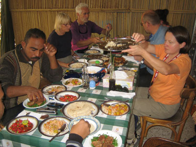 9. Tag in Assuan Wir bauen die Möbel aus dem Auto aus, um auch noch die letzten Glassplitter zu entfernen. Sogar den Kühlschrank muss ich zerlegen, weil Splitter durch die Lüftungsschlitze eingedrungen sind. Km 67/7.328. Donnerstag, 20. Dezember 7, Tag 28, 10. Tag in Assuan Während gestern und vorgestern die Stadt wie ausgestorben wirkte, ist heute viel los. Vor allem Kinder und Jugendliche belagern die Straßenküchen und die einfachen Lokale. Wir essen inmitten von -zig Jugendlichen ein Nudelgericht in einer Art arabischem Mc. Donalds. Das Essen wird frisch gemacht, man kann zusehen, wie zwei Männer wie Jongleure die Bestandteile des Gerichtes mit Löffeln aus Pfannen und Töpfen in die Teller werfen. Ca. alle 15 Sekunden ist ein Teller fertig! Eine Portion kostet übrigens 5 LE (0,67 EUR). Den Nachmittag verbringen wir wieder am Nilufer lesend in der Sonne. Am Abend wirds heute besonders kühl. Wir entzünden ein Feuer, an dem wir es dann doch bis neun aushalten. Km 49/7.377. |