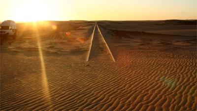 18: Hektik Gleich in der Früh fahren wir in die Oase Dakhla, tanken unsere Autos auf, kaufen Obst und Brot ein. Während die anderen in der heißen Quelle ein Bad nehmen, gehen Susi und ich in ein Internet-Cafe. Hier können wir endlich unser Notebook an eine ADSL-Leitung anstöpseln. Da flutschen jede Menge Mails herein. Unter anderem eines von Herrn Salah von der Nile-Transport-Company in Assuan: Wegen "holidays" an den Häfen verkehren ab dem 18. Dezember für 5 Tage keine Fähren. Wir müssen am 12. Dezember in Assuan sein, um die letzte Fähre vor den holidays zu erwischen. Das bringt echt Schwierigkeiten. Wir können zwar locker bis übermorgen Abend in Assuan sein, wenn wir gleich wegfahren, doch die Reifen für den Mercedes kommen inshallah erst heute spät am Abend und werden erst morgen Früh montiert. Ingrid und Gerd wollten nach der anstrengenden Wüstenfahrerei außerdem das Reisetempo ein wenig verlangsamen. Sie wollen daher eher erst nach den holidays in den Sudan. Ingrids Flug von Assuan nach Wien ist erst für 15. gebucht. Damit sie nicht zwei oder drei Tage ohne Peter in Assuan verbringen muss, wollen auch die beiden und Helmut an eine Fähre vor den holidays nur dann denken, wenn sich der Flug umbuchen lässt. Bei Susi und mir sieht das ein wenig anders aus: Im Gegensatz zu unseren Reisepartnern, die ja alle im Ruhestand sind, haben wir nicht unbeschränkt Zeit. Wir können uns eine Verzögerung von einer Woche oder länger (nach den holidays wird großer Andrang bestehen, vielleicht kämen wir nicht auf die erste Fähre) nicht leisten und müssen uns daher von der Gruppe trennen. Nach dem Mittagessen in einem netten Restaurant müssen wir uns nicht nur, wie geplant von Mahmoud, sondern auch von unseren Reisefreunden verabschieden. Wer weiß, ob es denn auch klappt, dass wir die Fähre erreichen und wir sehen uns früher, als gedacht. Wir verlassen Dakhla Richtung Kharga. Da wir gehört haben, dass man von Kharga manchmal nur in Polizeibegleitung nach Luxor fahren darf und dann die Chance groß ist, im Polizeikonvoi nach Assuan fahren zu müssen, noch dazu unterwegs hören, dass das derzeit so ist, umfahren wir den Polizeiposten in Kharga auf einem Schleichweg, den wir uns schon zu Hause mit Google Earth gesucht haben. Das funktioniert bestens, die Koordinaten stimmen bis auf wenige Meter und nach 20 Kilometern nicht allzu schlechter Piste sind wir schon wieder auf der Straße Richtung Baris, ohne einen Polizisten gesehen zu haben. Auf dieser Abkürzung begleiten uns Bahngleise. Susis Frage, wie oft hier wohl ein Zug fährt, ist rasch beantwortet (siehe Foto). Wir halten nach Einbruch der Dunkelheit kurz vor Baris und wollen gleich bei Sonnenaufgang wieder abfahren. Km 272/6.283. |