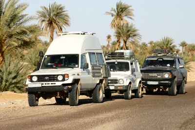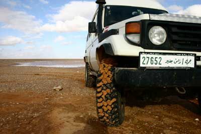 Rund um Algerien: Große Sahararundreise Jänner-März 2006Teil 3: Libyen Samstag, 28. Jänner 6, Tag 6 Die Abfertigung an der libyschen Grenze in Ras Ajdir erfolgt innerhalb von drei Stunden. Wir müssen einen Führer mitnehmen. Er nennt sich Bedu und spricht sehr gut Englisch. Er fährt bei Walter und Josef mit, sein Gepäck transportieren wir. In Zuara wechseln wir Geld (1 EUR = 1,63 LD) und füllen unsere Tanks voll. Diesel kostet 0,14 LD (0,09 EUR). Auch Brot ist sensationell billig: 5 große Baguettes kosten einen viertel Dinar (0,16 EUR). Zwischen Yfren und Az Zintan schlagen wir unser Nachtlager auf. Km 293/2.164. Sonntag, 29. Jänner 6, Tag 7 In Az Zintan füllen wir nochmals alle verfügbaren Tanks und Kanister, bevor wir entlang der Pipeline geradewegs nach Süden fahren. Wir wollen auf der Route A13c (Göttler) die Hamada al Hamrah und anschließend den Erg Ubari überqueren, insgesamt an die 1.000 Kilometer ohne Versorgungsmöglichkeiten. Leider ist die Piste nur in mäßigem Zustand und auch landschaftlich bietet die Gegend nördlich der Verbindung Darj-Garyat außer einem beachtlichen Geländeabbruch nichts. Der Toyota von Walter und Josef möchte aber doch ein wenig verweilen, was er durch zwei Reifenpannen zum Ausdruck bringt. Die Abendbeschäftigung besteht aus Reifenflicken. Der einsetzende kurze Regen macht die ohnehin niedrige Temperatur noch unangenehmer. Km 194/2.358. |