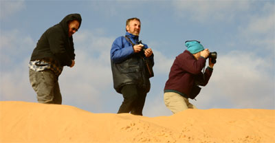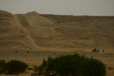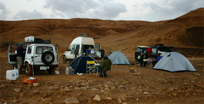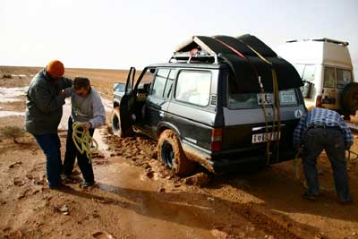 Montag, 30. Jänner 6, Tag 8 In der Nacht hat es stark geregnet, in den Zelten steht das Wasser zentimeterhoch. Schlafsäcke und Decken sind patschnass. Mitten in der Wüste haben sich zahlreiche Seen gebildet, auf der Piste sind schlammige Passagen entstanden und schon bleibt ein Toyo stecken. Zu Mittag machen wir eine Pause zum Trocknen der nassen Sachen. Nach öder Fahrt über die schier unendliche Ebene der Hamada erreichen wir am Abend den Abbruch bei Awaynat Win, an dessen Fuß wir lagern. Ein Lagerfeuer macht die eisige Temperatur erträglich. Km 263/2.622. |