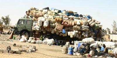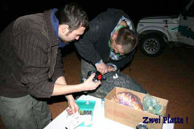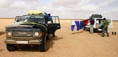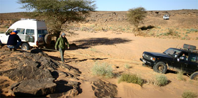 Dienstag, 7. Februar 6, Tag 16 Während Mohammed die Ausreiseformalitäten erledigt, haben wir Zeit, einen Reifen reparieren zu lassen, unsere Fahrzeuge zu säubern und Wäsche zu waschen. Als wir unsere Autos beim Zoll vorgeführt haben und unsere Papiere erhalten haben, ist es bereits 13 Uhr. Zunächst geht die Fahrt nach Tajari, wo sich, ca. 250 Kilometer vor der nigrischen Grenze, die letzte Tankstelle für 1.300 Kilometer befindet. Wir füllen alle Tanks und Kanister randvoll, melden uns vorschriftsmäßig bei der Polizei am südlichen Ortsausgang und verlassen dann die Zivilisation. Die weitere Strecke ist zunächst sandig und wir müssen kräftig Reifendruck ablassen. Nun ist sie gut befahrbar. Der Abend ist wegen des starken und kalten Windes ein wenig ungemütlich. Heute wird gemeinsam gekocht: Es gibt gebratene in Salz eingelegte Auberginen mit Bratkartoffeln und Tomatensalat. Das Wort des Jahres wird kreiert: Chaos-Cookinkg. Km 114/4.078. |