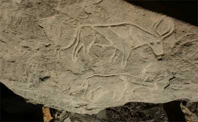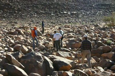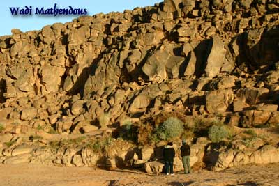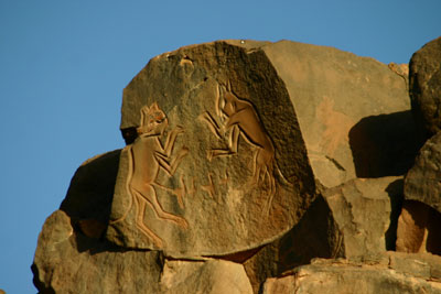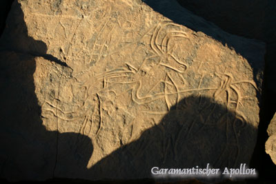 Freitag, 3. Februar 6, Tag 12 Da wir nicht wissen, ob für das Wadi Mathendous noch eine Bewilligung erforderlich ist, und wir ohnehin nicht auf dem gleichen Weg hin und zurück fahren möchten, fahren wir auf der Asphaltstraße Richtung Serdeles und zweigen dann (N26 05.420 E11 31.950) auf eine Piste nach Süden ab. Der vierte Patschen an Walter und Josefs Wagen regt schon keinen mehr auf, Reifenwechseln ist nun schon Routine. Die bei Göttler beschriebene Kreuzung "Trois Chemins" (N25 47.842 E11 43.653) ist bei genauer Betrachtung eine Kreuzung von zumindest fünf Wegen und wir haben daher ziemliche Orientierungsschwierigkeiten. Wer so wie wir zum Garamantischen Apollon möchte, nimmt den steilen Weg auf die Anhöhe hinauf. Hier gibt es zwei Wege, wobei der genau in unsere gewünschte Richtung (60 Grad) führende abgesperrt ist, der andere nicht. Wir wählen leider den nicht versperrten, von dem gelegentlich wieder gesperrte Wege abzweigen, die allesamt besser passen würden. Als irgendwann die von uns gewählte Piste in eine ganz unpassende Richtung dreht, nehmen wir einen abgesperrten Weg und erreichen nach einiger Zeit jenen Weg, der von der Anhöhe mit 60 Grad Peilung wegführt. Auf dieser Piste erreichen wir nach stundenlanger Rumpelei bei einer Durchschnittsgeschwindigkeit von 10 km/h das Wadi, in dem Göttler prähistorische Felsgravuren beschreibt. Da leider die Kilometerangaben nicht stimmen, suchen wir zunächst an falscher Stelle und erst nach längerer Suche finden wir auch wirklich einige Gravuren an den Felswänden: Von N25 51.806 E11 51.299 ca. 200 Meter wadiauf- und abwärts. Die Bilder sind ca. 4- bis 5.000 Jahre title und zeigen Tiere, die es damals hier gegeben hat: Elefanten, Giraffen, Antilopen. Weitere stundenlange Rüttelei über schier endlose Steinebenen führt uns zum Garamantischen Apollon, einer von Heinrich Barth entdeckten Felsgravur, die zwei jagende Figuren zeigt. Die unscheinbare Gravur ist nicht gleich zu entdecken. Sie befindet sich nicht an einer Wand, sondern auf dem Boden. Km 279/3.315.