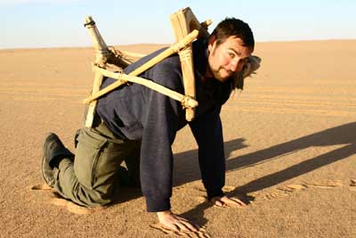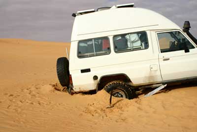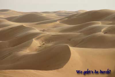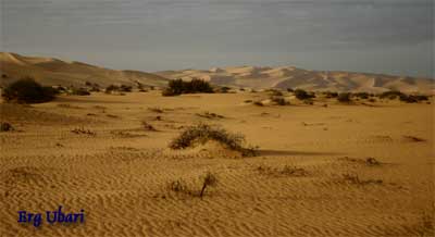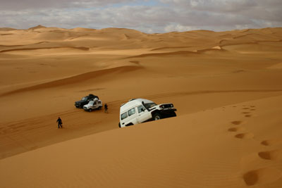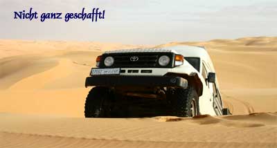 Mittwoch, 1. Februar 6, Tag 10 In der Früh versuchen wir unser Glück im Internetcafe von Idri, doch es hat um 9 Uhr, so wie die meisten Läden der Stadt, noch geschlossen. Da sich das Wetter gebessert hat, wollen wir den Erg Ubari von Berghen nach Terkiba überqueren, an jener Stelle, wo wir voriges Jahr gescheitert sind. Die ersten 30 Kilometer sind steinig und problemlos befahrbar, doch danach beginnt der Sand und nun macht sich auch der Wind wieder unangenehm bemerkbar. Nachdem wir das Wadi Zellaf passiert haben, werden die Dünen höher und türmen sich zu riesigen Gebirgen auf. Oftmals liegen die Täler dazwischen nicht in unserer Zielrichtung und so müssen immer wieder hohe Dünen überquert werden. Mehrmals erweist sich ein eingeschlagener Weg als Sackgasse und wir müssen wieder ein Stück zurück. Als es dämmert, schlagen wir unser Lager inmitten der Dünen auf. Ob wir es morgen bis Terkiba schaffen werden? Dort würde ein Campingplatz mit Duschen auf uns warten. Km 166/2.960.