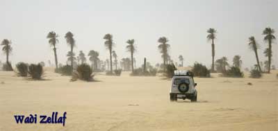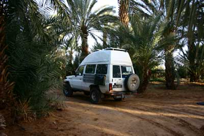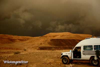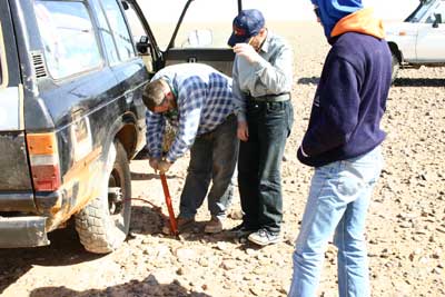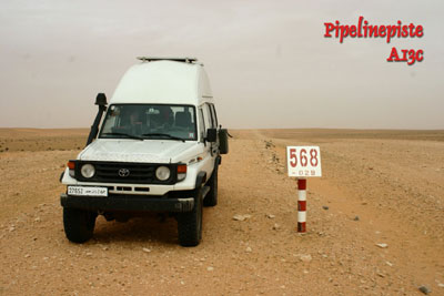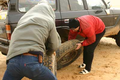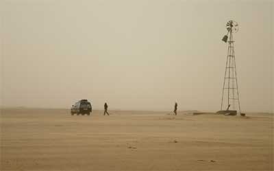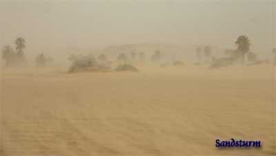 Dienstag, 31. Jänner 6, Tag 9 Diese Nacht hat es zwar nicht geregnet, doch während des Frühstücks braut sich ein Gewitter mit schwarzgrauen Wolken und Donner zusammen. Wir schaffen es nicht mehr ganz, vor dem Regen alle unsere Sachen trocken in die Fahrzeuge zu bringen. Unser heutiges erstes Ziel ist die nahe gelegene Polizeistation Awaynat Win, wo ich vor einem Jahr einen schwerkranken Polizisten behandelt habe. Wir hoffen, zu erfahren, was aus ihm geworden ist. Ich hege die Befürchtung, dass er trotz meiner damaligen Hilfe verstorben sein könnte. Doch wir hören von seinen Kollegen, dass er wieder ganz gesund geworden ist und noch immer Dienst an dieser Station macht. Zur Zeit ist er gerade auf Heimurlaub. Auf der Weiterfahrt zum Brunnen Hassi el Hassi ist es nebelig und der Wind wird stärker. Während unseres Aufenthaltes am Brunnen bemerken wir einen Mantelbruch an Walter und Josefs Toyota: Der dritte Reifen ist also kaputt. Langsam gehen den beiden die Reserveräder aus. Während wir die Räder wechseln, entwickelt sich aus dem Wind ein Sandsturm, der nur deshalb nicht so verheerend wie im letzten Jahr ist, weil es nur knapp über 10 Grad hat. Weil das halt nicht das ideale Wetter für Dünenüberquerungen ist, beschließen wir, anstatt entlang der Pipeline weiterhin geradewegs nach Süden, von hier nach Idri zu fahren. Hier können vielleicht auch Reifen repariert oder gekauft werden. Der Boden ist noch immer feucht und wir hinterlassen tiefe Spuren. Vielfach ist die Sicht durch den Sandsturm stark beeinträchtigt. Wir erreichen Idri am Abend und Walter und Josef können tatsächlich einen Reifen reparieren lassen, sowie einen weiteren gebraucht erstehen. Wir nächtigen in einem netten Palmengarten etwas außerhalb des Ortes. Km 173/2.794.