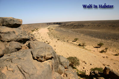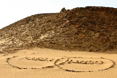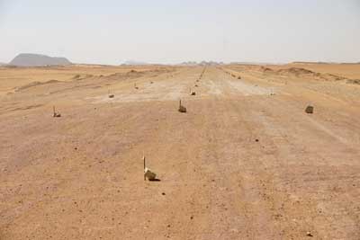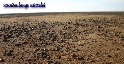 Mittwoch, 8. Februar 6, Tag 17 Es will nicht wärmer werden: In der Früh zeigt das Thermometer 5 Grad! Am Vormittag finden wir am Fuße eines Hügels eine aus Steinen gelegte Schrift. Eine Sure aus dem Koran? Eine Grabinschrift? Erst ein Blick vom Hügel hinunter lüftet das Geheimnis: Auf dem Kopf stehend ist zu lesen: Gerti & Fredi. Ganz in der Nähe finden wir sehr schöne Steine und Blitzröhren. Weiter geht es zunächst über sandig-steiniges Gelände, bis wir endlich die neue Piste nach Tummo erreichen. Sie ist knapp zehn Meter breit und recht glatt, so dass wir hier gut vorankommen. An manchen Stellen ist sie mit Betoneisen und Steinen recht eigenartig markiert. Die letzten 30 Kilometer vor der Grenze sind asphaltiert, wobei wir es recht ungewöhnlich finden, dass die Asphaltierungsarbeiten von Süd nach Nord stattfinden. Umgekehrt könnte man das Material auf der bereits asphaltierten Straße bequem anliefern. |