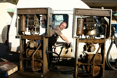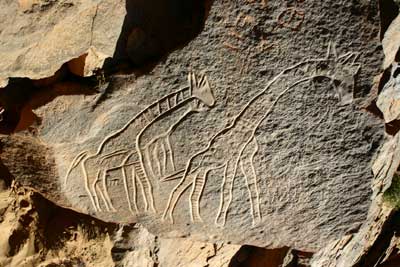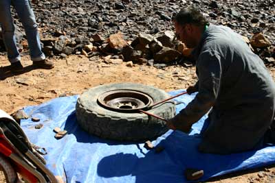 Sonntag, 5. Februar 6, Tag 14 In der Morgensonne besichtigen wir die berühmten prähistorischen Felsgravuren des Wadi Mathendous. An den Felswänden tummeln sich jahrtausendealte Giraffen, Elefanten und Antilopen. Daneben finden wir Jagdszenen, ein Krokodil und Strauße. Bei der Ausfahrt bezahlen wir die Besichtigungsgebühr in Höhe von 3 LD (1,8 EUR) pro Person und die Fotoerlaubnis von 5 LD (3,1 EUR). Nach wenigen Kilometern lassen wir endlich die weiten Steinfelder hinter uns und es ist nach Tagen erstmals wieder möglich, auf den dritten, ja auf den vierten Gang zu schalten. Nach wie vor machen wir regelmäßige Pausen zum Luft einpumpen. Am späten Nachmittag erreichen wir dann Germa, wo wir, während alle defekten Reifen repariert werden, einen Ölwechsel an unserem Fahrzeug machen lassen. 12 Liter Öl kosten 31,5 LD (19,7 EUR), die Arbeit 2 LD (1,25 EUR). Wir übernachten noch einmal am Campingplatz in Terkiba. Km 179/3.549. |