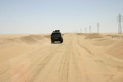 Montag, 6. Februar 6, Tag 15 Heute ist früh Tagwache, denn wir haben einen weiten Weg vor uns. Zügig geht es auf guter Asphaltstraße über Murzuk, wo wir uns (wieder einmal) die Festung ansehen, und Traghan nach Um El Aranib, von wo geradewegs nach Süden die Straße nach Al Katrun abzweigt. Sie ist eine der übelsten, die Libyen zu bieten hat. Nach den Sandstürmen der vergangenen Woche ist sie jedoch relativ zahnlos (siehe Bild). Gegen Abend kommen wir nach Katrun, wo wir im italienischen Fort von Mohammed Taher unser Lager aufschlagen. Mohammed, der hier eine Reiseagentur betreibt, erledigt gegen Entgelt die komplizierten Ausreiseformalitäten (pro Person 25, pro Fahrzeug 10, abzüglich Kaution für das Kennzeichen 25 LD). Die Übernachtung im Fort ist obligat und kostet 15 pro Person und 5 LD pro Fahrzeug. Hat er uns voriges Jahr noch das Abendessen spendiert, traut er sich heuer 50 EUR für 6 Portionen zu verlangen! 6 Portionen? Ja, richtig gelesen. Noch vor dem Abendessen verlässt uns Bedu. Er ist schon mächtig im Stress, weil er übermorgen in Zuara eine neue Reisegruppe übernehmen muss. Der Abschied ist herzlich, denn wir haben uns recht angefreundet mit ihm. Als Geschenk erhält er eine CD mit den Fotos, die wir bisher gemacht haben. Außerdem wird er von Martin auf arabisch verabschiedet: Ya nahabibu. Af shukr lil djaula wa a da lil fil Libya. Anta nuhibbu wa namalu, an ahbabta ar rihlana. Ahlan wa sahlan fil nemsa. Fil nemsa yudjad shai, asir wa bira. Itha auta marid, indana at tabibun djaiyidun wa dawa. Al-an ithab fil shamal wa uktub al e-mail. Ila al-liqa. Km 385/3.934.