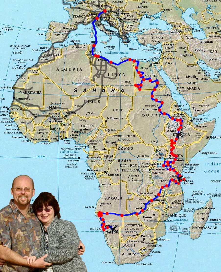 Auf unserer 20. Afrikareise durchqueren wir Afrika von Ost nach West. Diesmal gibt's wenig Sand, dafür vermutlich jede Menge Schlamm, denn es ist noch Regenzeit ... Zur Erinnerung: Wir haben auf dem Weg ins südliche Afrika im Jänner in Äthiopien und im Juli in Tansania Halt gemacht und dort unser Buschtaxi eingestellt. Zunächst wollen wir ein paar Tage auf der Gewürzinsel Sansibar relaxen und die weißen Sandstrände des Indischen Ozean genießen. Per Propellerflugzeug geht es nach Dar es Salaam, wo wir unser Auto abholen. Im Süden Tansanias gehen wir noch einmal auf Safari. Wegen der Regenzeit queren wir Sambia recht rasch. Bevor wir nach Namibia reisen, machen wir bei den Victoria-Fällen Halt. Über den Caprivistreifen geht es ins Kaokoveld, wo wilde Offroadstrecken und Begegnungen mit den noch sehr urtümlichen Himba auf uns warten. In Swakopmund besuchen wir unsere aus Österreich ausgewanderten Freunde. Danach stellen wir unser Buschtaxi in Windhoek ein und fliegen nach Österreich zurück, um im Herbst zu einer Erkundung des südlichen Afrikas wiederzukehren. Susi und Werner Etappe