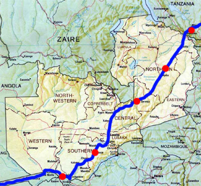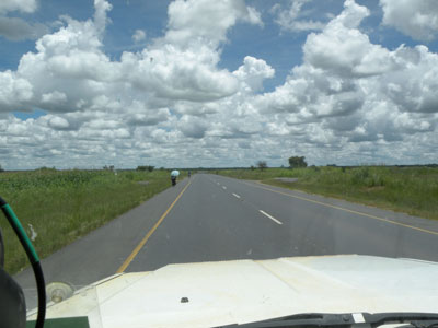 Samstag, 31. Jänner 9, Tag 14, Lusaka Heute ist ein reiner Fahrtag. Zu Mittag erreichen wir Kabwe, wo wir seit Sansibar erstmals wieder ein Internetcafe finden, wo wir unser Notebook anstöpseln können. Doch die Verbindung ist so langsam und ständig unterbrochen, dass wir nur einen Teil unserer Mails empfangen können. Erst kurz vor Lusaka wechselt die Landschaft ein klein wenig. Es gibt nun mehr Felder, teilweise auch sehr große, zu Farmen gehörend. Lusaka durchfahren wir einfach, es gibt dort nichts besonderes zu sehen oder zu tun. Südlich von Lusaka wird es ein wenig hügelig, eine willkommene Abwechslung nach tausend Kilometern Ebene. Wir übernachten neben der Straße Lusaka-Livingstone im Busch. Da es am Abend nicht regnet (hat es schon am Nachmittag), wird aufwändig gekocht: Spiegeleier, Pommes frites und Tomatensalat. Leider gibt es viele Mücken. Km 614/3.064/19.694. |