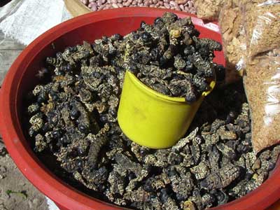 Montag, 2. Februar 9, Tag 16, Caprivi Bis zur Grenze ist es beidseits der Straße sehr sumpfig. Es grenzt an ein Wunder, dass wir gestern einen trockenen Nachtplatz gefunden haben. Der Grenzort Sesheke ist ein übles Kaff, das nichts zu bieten hat außer einem Markt. Wir kaufen Brot, Obst, Gemüse, Eier. Hier gibt es auch wieder die appetitanregenden getrockneten Maden. Eigentlich wollten wir unsere restlichen Kwacha in Namibia-Dollar wechseln, doch der Kurs, den die Geldwechsler auf der Straße anbieten ist echt schlecht und Bank scheint es keine zu geben. Was soll's? Wir wechseln in Namibia. Die gesamte Grenzbürokratie lässt sich rasch und unkompliziert in einem kleinen Gebäude etwas abseits des Grenzbalken erledigen und dann geht es über den Sambesi hinüber nach Namibia. Diesel in Sambia: 5.430 - 5.790 ZMK = 0,92 - 0,98 EUR. |