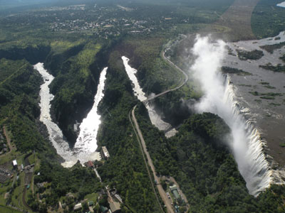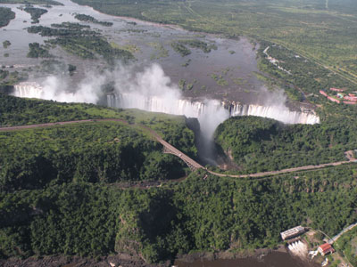 Sonntag, 1. Februar 9, Tag 15, Livingstone, Victoria-Falls Die letzten 100 Kilometer bis Livingstone sind sehr mühsam, da im ersten Teil die Straße neu gebaut wird und man eine rumpelige Umleitung fahren muss und im zweiten sieht man, warum die Straße neu gebaut werden muss: Es ist kaum mehr Asphalt da. In Livingstone fahren wir zielstrebig zu den Fällen. Der Parkplatz macht einen sicheren Eindruck, kostet 3 USD = 2,30 EUR, doch niemand kassiert. Wir überlegen kurz, ob wir die Fälle mit Minimalbekleidung und Badeschlapfen oder mit normaler Kleidung, Regenjacke und Sportschuhen besichtigen wollen und entscheiden uns für letztere Variante. Der Eintritt zu den Victoriafällen kostet 10 USD = 7,70 EUR p.P. Wir gehen zunächst den Bridge-Trail, von dem aus sich ein schöner Ausblick auf die Straßen- und Bahnbrücke und den Sambesi unterhalb der Fälle bietet. Dann ziehen wir uns die Regenjacken an und gehen den Eastern-Cataract-Trail. Wir stehen etwa auf gleicher Höhe zur Fallkante und sehen, wie die ungeheuren Wassermassen vor uns in die Tiefe stürzen. Die Gischt regnet auf uns nieder und wir sind trotz der Regenmäntel in Kürze ziemlich durchnässt. Nur an wenigen Stellen kann man überhaupt daran denken, einen Fotoapparat aus der Tasche zu nehmen. Das von einem unglaublichen Tosen begleitete Naturschauspiel ist kaum in Worte zu fassen, so grandios wie kaum etwas je zuvor gesehenes ist es. Völlig durchnässt gehen wir zurück und dann ein Stück den Sambesi oberhalb der Fälle entlang. Hier wirkt er ruhig, grad so, als wüsste er noch nicht, was auf ihn zukommt. Nachdem wir uns trockene Kleidung angezogen haben, fahren wir nach Livingstone zurück, essen im "Hungry Lion" vorzügliches Huhn und schlendern noch über den Souvenirmarkt, wo wir zwei nette Gehstöcke erstehen. Nun habe ich eine Überraschung für Susi: Wir sehen uns die Victoria-Fälle nocheinmal an, mit einem Hubschrauber von oben. Erst der Blick aus der Vogelperspektive macht deutlich, dass die riesigen Wasserfälle, die wir am Vormittag gesehen haben, nur ein Teil der gesamten Falls sind. Auf der Seite Simbabwes gibt es noch viel mehr Wasserall zu sehen, das dann aber ein ander Mal! Auf dem Rückflug machen wir noch Elefanten, Büffel und ein paar Hippos aus. Nun verlassen wir Livingstone nach Westen, müssen bei der Ausfahrt 20.000 ZMK = 3,40 EUR Abgabe an das lokale Government entrichten. Auch weit außerhalb der Stadt ist neben der Straße entweder eingezäuntes Farmland oder sumpfiges Gebiet. Wir übernachten auf einer Zufahrt zu einer Schule. Km 343/3.407/20.037. |
