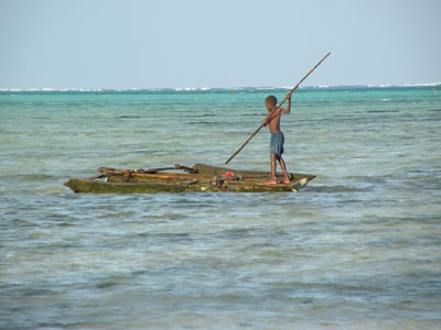 Montag, 19. Jänner 9, Tag 2, Sansibar In Mombasa gibt es eine Zwischenlandung; wir sitzen zwei Stunden auf dem Flughafen herum. Die afrikanische Schwüle ist bereits voll spürbar. Nach gut einer halben Stunde weiterer Flugzeit landen wir auf Sansibar. Unser Gepäck wird von Trägern auf ein Pult gestellt, es gibt kein Förderband. Das Visum ist problemlos um 50 USD (38,50 EUR) erhältlich, ich muss die letzte freie Seite in meinem Reisepass opfern. Vor dem Flughafen wartet bereits unser Mietwagen (Zanzibar Car Hire, 40 USD = 30 EUR pro Tag). Die Fahrt an die Ostküste der Insel ist zunächst sehr anstrengend, denn wir stürzen uns mit einem rechtsgesteuerten Suzuki Escudo mit ungewohntem Automatikgetriebe in den Linksverkehr des afrikanischen Straßengeühls. Auf der gut 40 km langen Fahrt gibt es vier Verkehrskontrollen. Man interessiert sich ausschließlich für den internationalen Führerschein; dass dieser bereits seit langem abgelaufen ist, spielt keine Rolle. Auf Anhieb finden wir unser Hotel in Jambiani. Unser Bungalow liegt direkt am weißen Sandstrand und ist einfach aber sauber (Shehe Bungalows, bei hostelbookers gebucht um 14 EUR/p.P/p.N. incl. Frühstück). Wir genehmigen uns gleich ein Mittagessen und legen uns dann aufs Ohr, um ein weng Schlaf nachzuholen. Das Abendessen nehmen wir bei Kerzenschein ein, denn der Strom ist ausgefallen. Erfreut nehmen wir zur Kenntnis, dass es keine Mücken gibt. Km 60/60/16.630. |
