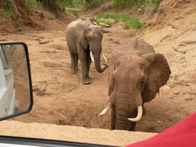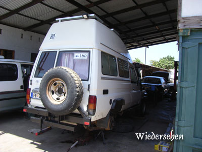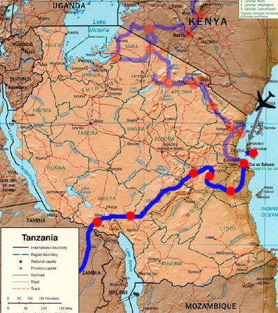Sonntag, 25. Jänner 9, Tag 8, krank Da fehlen zwei Tage, mag sich mancher denken. Das liegt daran, dass mir die letzten zwei Tage nicht zum Schreiben zu Mute war: Ich war krank. Jetzt sitzen wir gerade im Dunkeln in einer Waldlichtung am Fuße der Uluguru-Mountains und erstmals kommt ein wenig Lust auf, wieder zu schreiben: Freitag, 23. Jänner 9, Tag 6, Wiedersehen Als wir am Flughafen in Zanzibar ankommen, erwartet uns schon der Autoverleiher. Ich beichte ihm den Diebstahl des Außenspiegels, worauf er meint, das ließe sich mit 50 Dollar (38,50 EUR) wieder gut machen. Doch da stößt er bei mir auf taube Ohren, denn er hat mir per Mail versprochen, dass das Auto "full insured" ist. Er meint noch, bei einem Unfall wäre der Schaden gedeckt, aber bei einem Diebstahl zahlt die Versicherung nicht. Ich lasse mich auf keine Diskussionen ein, übergebe ihm den Autoschlüssel, drücke ihm noch freundlich die Hand und verabschiede mich. Das Einchecken am Zanzibar Airport ist echt urig, weil die keine Computer haben. Der Check-in-Schalter ist praktisch noch auf der Straße, die Bordkarten werden von Hand ausgefüllt, das Gepäck trägt man nach dem Abwiegen zu einem Tisch, wo es nicht sehr gründlich durchsucht wird (unsere Stoßdämpfer werden nicht gefunden), dann wird man zu einem Schalter geschickt, wo man die Ausreisesteuer (!) bezahlen muss, für Inlandsflüge 5.000 TZS = 3 EUR, für Auslandsflüge 30 USD = 23 EUR. In der schwach besetzten Propellermaschine der Precision-Airlines ist freie Platzwahl. 20 Minuten nach dem Start setzen wir schon am Flughafen Dar es Salaam auf. Die Taxifahrer sind organisiert, das heißt, man kriegt einen zugeteilt und die Preise sind hoch und fix. Als wir bei unserem Autoeinstellplatz eintreffen, ist die Wiedersehensfreude groß: Da steht es, unser Buschtaxi, und wartet schon auf uns. Es ist schon aufgebockt und fertig für's Stoßdämpferwechseln. Danach ist genug Zeit, unsere mitgebrachten Sachen zu verstauen, im Laden um die Ecke ein paar Einkäufe zu tätigen und das Auto reisefertig zu machen. Es ist unheimlich heiß und obwohl wir meist im Schatten eines großen Baumes sind, fröstle ich am Abend, krieg sogar später noch Fieber. Ich fühl mich ziemlich elend, wie bei einer Grippe, nehm ein Aspirin und geh um 8 schlafen. Km 60/460/17.090. Samstag, 24. Jänner 9, Tag 7, Dar es Salaam Gegen 2 Uhr erwache ich vom Surren mehrerer Mücken, die mich auch schon gestochen haben, außerdem tun mir alle Knochen weh, ich kann nicht mehr liegen. So stehe ich auf und wir beginnen mit der Moskitojagd. Leider hat unser Mückenplättchenerhitzer versagt, später werde ich feststellen, dass die verwendete Steckdose keinen Strom hat. In der Früh fühle ich mich wie gerädert, mag kaum etwas frühstücken und bin ziemlich antriebslos. Um 8 ist es jedoch schon so heiß, dass Abfahren das kleinere Übel ist. Obwohl wir nicht durch's Zentrum fahren, sondern die Umfahrungsstraße nach Süden nehmen, brauchen wir gut zwei Stunden, bis wir Dar es Salaam hinter uns haben. Zu Mittag halten wir in einem Dorf und ergattern an einer Straßenküche die letzten Stücke eines gekochten Huhnes und zwei Djabati. In Kibiti biegen wir von der nach Süden führenden Hauptstraße nach Westen ab. Die Piste ist anfangs in bestem Zustand und man könnte leicht 100 Sachen fahren, würde man sich nicht der Radfahrer und Fußgänger erbarmen, die den Staub schlucken müssen. Später wird die Piste schlechter und das Fahren strengt mich sehr an, doch wir wollen unbedingt bis knapp vor das Gate des Selous-Nationalparks fahren, damit wir morgen den ganzen Tag für die Safari haben. Wir fahren zunächst ins Mloka-Camp, das uns empfohlen wurde, doch hier ist man nicht für Leute eingerichtet, die im Auto schlafen. Wir müssten auf dem außerhalb liegenden Parkplatz übernachten. Man reicht uns ans Nachbarcamp weiter, wo man besser zufahren kann, doch hier kommen wir mit dem Preis nicht zurecht. So fahren wir noch ein Stück weiter, bis wir an die Grenze des Nationalparks kommen. Um die Grenze klar zu markieren und Wilderern keine Ausrede zu geben, hat man eine breite Schneise in den Wald geschlagen. Hier fahren wir ein Stück hinein und finden ein nettes Plätzchen. Noch eine Stunde vor Sonnenuntergang hat es 44 Grad, die Hitze ist kaum zu ertragen. Ich hab wieder Fieber, nun auch Bauchkrämpfe, und "endlich" auch Durchfall. Susi ist "nur" von der Hitze fertig. Wieder geh ich todmüde früh zu Bett, allerdings nicht ohne eine weitere Grippetablette. In der Nacht kühlt es kaum ab. Wir liegen ohne Kleidung, ohne die dünnste Decke im Bett und schwitzen. Plötzlich werde ich munter. Ich höre Schritte. Jemand geht um unser Auto. Aus der Abolge der Schritte schließe ich, dass es kein Mensch ist, sondern ein Vierbeiner. Ich möchte eigentlich aufstehen und rausschauen, bin aber doch zu müde dazu. Ich bin aber nicht zu müde, um mir Sachen durch den Kopf gehen zu lassen: Ich fantasiere von wilden Löwen, Elefanten und Hyänen, die unser Auto umkreisen. Plötzlich rieche ich Zigarettenrauch. Also ist doch ein Mensch draußen. Über mehrere Stunden träume, wache, phantasiere ich, verliere das Gefühl für die Realität. Km 267/727/17.357. Sonntag, 25. Jänner 9, Tag 8, Selous Game Reserve Und wieder stehe ich wie gerädert auf, alle Knochen tun weh und der Schweiß tropft von der Stirn. Ich habe keinen Appetit, außer auf eine Grippetablette und ein paar Bissen von der Ananas, die wir gestern erstanden haben, ein Riesenexemplar zum Preis von 1.000 TZS (0,59 EUR). Das Mtemere-Gate befindet sich mehrere Kilometer einwärts der Nationalparkgrenze, an der gleich mehrere Schilder darauf hinweisen, dass die Einfahrt nur mit Genehmigung erlaubt ist. Zudem sind die im Gabriel'schen Reiseführer angegebenen Koordinaten des Gates falsch. Richtig ist: S7 45 03,7 E38 12 11,1. Diese beiden Umstände führen dazu, dass wir uns doch einige Zeit unsicher sind, ob wir nicht vielleicht auf einer falschen Piste in den Par