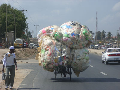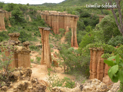 Montag, 26. Jänner 9, Tag 9, Morogoro In der Früh fühl ich mich erfreulich gut. Wir fahren den Ostrand der Uluguru-Mountains nach Norden entlang, die Piste ist durchwegs schlecht. Sie führt durch niedrige Buschwälder, die teilweise gerodet sind und landwirtschaftlich genutzt werden. Es ist ein üppiges Grün, das uns umgibt. Es beginnt schon am Vormittag zu regnen und der Niederschlag hält mit einigen Pausen bis zum Nachmittag an. Es ist nun klar: Der gestrige kurze Schauer war der Beginn der Regenzeit. Gegen Mittag erreichen wir die Stadt Morogoro. Da uns gestern im Selous ein hochschnellender Ast das Spiegelglas eines Außenspiegels zerbrochen hat, wollen wir hier einen neuen Spiegel zuschneiden lassen. Wir staunen nicht schlecht, als uns in einem Autozubehörgeschäft ein neuer Komplettspiegel für unseren Toyota um nur 15.000 TZS = 8,90 EUR angeboten wird. Allerdings haben sie nur rechte Spiegel, wir brauchen aber einen linken. In einem weiteren Geschäft geht es uns nicht anders. Nach längerem Herumfragen landen wir schließlich in einem großen Geschäft, in dem Elektrogeräte und Möbel verkauft werden. Hier wird uns ein Spiegel zugeschnitten. Doch weil der deutlich dicker ist als der originale, bricht er beim Einbauen. Erst als wir die Plastikleisten im Spiegelgehäuse kürzen, passt ein weiterer zugeschnittener Spiegel, der sicherheitshalber noch mit einem Kilo Silikon festgeklebt wird. Der Spaß kostet nach Handeln 18.000 TZS = 10,60 EUR. Der Aufenthalt in Morogoro hat ca. drei Stunden in Anspruch genommen und als wir abfahren, muss ich feststellen, ich bin total erschöpft. Zu früh gefreut, was die Genesung betrifft! Schon nach kurzer Zeit machen wir Pause und ich muss mich hinlegen. Ich schlafe sofort ein, werde aber bald von Bauchschmerzen und einem Schweißausbruch geweckt. Trotz meiner Übelkeit fahren wir noch ein Stück den Tan-Zan(Tanzania-Zambia)-Highway Richtung Westen und finden nach längerer Suche einen schlechten Nachplatz knapp 100 Meter neben dem Highway im dichten Busch. Weiter weg von der Straße geht's unmöglich. In der Nacht haben wir eine Mücke im Auto, die wir so rasch wie möglich rausbefördern. Doch die Bewegung tut meinem Bauch nicht gut, ich krieg wieder Krämpfe und auf dem Weg zur Toilette kollabiere ich. Jetzt ist Schluss mit meiner Geduld: Es ist Zeit für's Antibiotikum. Km 180/1.075/17.705. Dienstag, 27. Jänner 9, Tag 10, Isimilia-Schlucht Der Highway führt auf ca. 50 Kilometer durch den Mikumi-Nationalpark. Wegen des großen Wildtierbestandes im Park gilt eine Höchstgeschwindigkeit von tagsüber 70 und nachts 50 km/h, die allerdings wegen der vielen brutalen Speedbreaker gar nicht erreichbar ist. Man sieht von der Straße aus große Antilopenherden, viele Giraffen und einige Affen. Danach führt der Highway durch das Ruaha-Tal, das von gleichmäßigem Grün überzogen scheint, alle Bäume sind gleichfarben und gleich hoch. Immer wieder gibt es Polizeikontrollen, doch meistens werden wir durchgewunken. Außer einmal. Da hatten sie eine Laserpistole. Ich bin 60 im Ortsgebiet gefahren. Der Inspektor ist sehr freundlich, bietet mir gleich ein Stück eines gegrillten Maiskolben an, das Bußgeld beträgt 50.000 TZS = 30 EUR, Fahrzeugpapiere will er nicht sehen, wo wir denn herkommen, aha aus Australia, und wo soll's denn hingehen, soso, ach 50.000 ist zuviel? Na dann halt 20.000 (12 EUR), ja natürlich gibt's eine Quittung, die Dame im Auto ist Ihre Frau? Dann ist sie meine Schwägerin, ja ich bin auch verheiratet, werde ich ausrichten, und gute Fahrt noch! Die Quittung ist natürlich nicht nummeriert und wird auch nicht einem Durchschreibeblock entnommen, eine kopiertes Formular einfach ... Kurz nach Iringa sehen wir uns die Isimilia-Schlucht an (mit Führung 3.000 TZS = 1,80 EUR p.P.), wo durch Erosion, ähnlich wie am Südtiroler Ritten, hohe Sandsteinsäulen entstanden sind. Hier befindet sich auch eine Fundstelle prähistorischer Steinwerkzeuge. Kurz nach Makambako finden wir einen netten Nachtplatz im lockeren Busch neben dem Highway. Ob's am Antibiotikum liegt, dass es geht mir viel besser geht? Ich habe sogar schon ein wenig Appetit, nur halt auf Bier noch nicht. Km 435/1.510/18.140. Mittwoch, 28. Jänner 9, Tag 11, Mbeia Ich fühle mich prächtig! Die Krankenschwester wird fristlos entlassen! Das Frühstück fällt karg aus, denn leider ist uns das Weißbrot schimmlig geworden und Vollkornbrot erlaube ich mir noch nicht. Zu allem Überfluss müffelt auch noch das Wasser aus unserem Tank, das wir gleich entleeren. Wir müssen heute frisches besorgen. Während der Fahrt schreibt Susi eine lange Liste, was wir in Mbeia alles besorgen wollen. In einem Vorort halten wir und plötzlich kommen wie auf Befehl zehn bis zwanzig Verkäufer mit Waren, vorwiegend Obst und Gemüse, auf uns zugestürmt. Der erste will mir gleich einen Kübel Kartoffeln verkaufen. Kostet einen Spottpreis, aber was sollen wir mit sovielen Erdäpfeln? Ich nehm mir ein paar raus und bezahle ein Viertel vom Preis des ganzen Kübels. Ähnlich geht es mit Tomaten und Bananen. Dann kaufen wir noch Zwiebeln, eine Ananas, Mangos, Brot, Getränke. Nun gehen wir die Geschäfte entlang und kaufen noch in einem Laden Milch und Margarine. Der Verkäufer muss zuerst einmal die Musik leiser drehen, damit er versteht, was wir wollen. Die afrikanische Musik hat uns gut gefallen und ich kaufe ihm gleich die CD ab. Wir erstehen dann noch um 3.000 TZS = 1,80 EUR ein Pannendreieck, denn in Sambia muss man zwei haben, und schon ist fast alles eingekauft. Die Suche nach einem Internetcafe ist nicht ganz einfach und dann lassen sich leider unsere neuesten Berichte nicht hochladen. Auch die Suche nach Wasser aus einem Schlauch ist schwierig. An mehreren Tankstellen gibt's Wasser nur aus der Tonne. Wir versuchen es bei einem Hotel. Da liegt auch schon der Gartenschlauch. Als zivilisierter Mensch nehmen wir aber nicht gleich, sondern fragen zuerst. Man hilft gerne, muss aber zuerst nach d