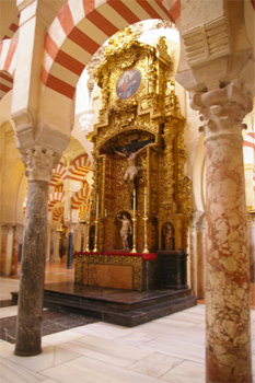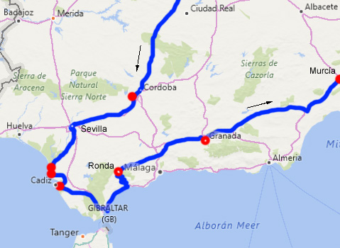 Plötzlich sind die Dörfer nicht mehr steingrau, sondern weiß. Wir sind in Andalusien. In Cordoba sehen wir uns die Mezquita an, eine Sehenswürdigkeit, die ihresgleichen sucht: In die im 8.-10. Jahrhundert errichtete riesige Moschee mit knapp 1.000 orientalischen Säulen und einer Fläche von drei Fußballfeldern (!) wurde im 16. Jahrhundert eine Kathedrale gebaut, zudem wurde die Moschee mit unzähligen Altären christianisiert. Wir spazieren noch durch das ehemalige Judenviertel mit einem Gewirr von engsten Gassen und weiß gestrichenen Häusern. Wir übernachten dreißig Kilometer außerhalb Cordobas hoch über einem Stausee, an dessen anderem Ufer sich eine Burg befindet. Genau dahinter geht kitschig die Sonne unter. Km 314/3.403/94.160.
