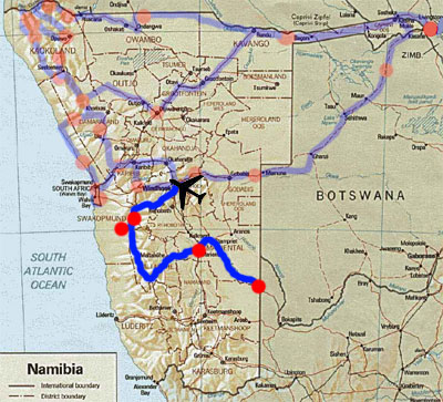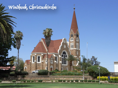 Montag, 16. November 9, Tag 2, Windhoek Unser Landcruiser wartet schon uns vor der Halle. Wir verstauen unser Gepäck, füllen den Wassertank und fahren sofort ab. In Windhoek führt uns der erste Weg in die Werkstatt, wo wir die von zu Hause bestellte dritte Batterie abholen und einbauen. Um rasch im Busch zu sein, beschränken wir die Stadtbesichtigung auf ein Minimum, machen einen Spaziergang um die Christuskirche (leider geschlossen), durch den Park vor der Tintenburg und zur alten Festung mit dem Historischen Zug. Vor der Festung wird gerade das Reiterdenkmal neu aufgebaut - jeder Stein des Sockels ist nummeriert -, das dem Neubau des Museums weichen musste. Nun verlassen wir die Stadt Richtung Südwesten und fahren über den Kupferberg-Pass ins Khomas-Hochland. Wir passieren den Gamsberg-Pass und genießen das tolle Panorame über ein wildes aufgefaltetes Gebirge. Der Gaub-Pass ist ein Schwindel, weil er kein Pass ist, also zuerst rauf und dann runter führt, sondern die Durchquerung eines kleinen Canyon ist. Kurz darauf passieren wir laut einem Schild den südlichen Wendekreis, der auf unserer Karte allerdings deutlich nördlich des Gaub-Passes verzeichnet ist. Als wenig später der Zaun des Namib-Naukluft-Nationalparks rechter Hand zurückweicht, finden wir einen tollen Nachtplatz hinter einem Steinhügel inmitten einer Grassavanne. Wir beschließen unseren ersten Abend wieder in Afrika mit einem Lagerfeuer. Km 292/292/28.476. |