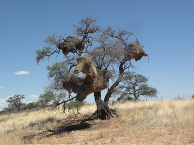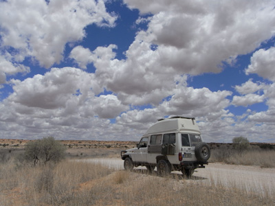 Donnerstag, 19. November 9, Tag 5, Mariental Gleich in der Früh lassen wir unseren Auspuff reparieren. Schon vor einigen Tagen haben wir bemerkt, dass die Dichtung eines Flansches kaputt ist und zwar genau unter dem Beifahrerfußraum. Susi hat schon seit geraumer Zeit nach längerer Fahrt gegrillte Füße. Die einzige Werkstätte, die wir in Mariental finden, ist eine Reifenwerkstätte. Hier fragen wir mal. Zufällig hat der Vater einer Reifenmonteurin eine Auspuffwerkstätte. Diese ist in einer kleinen Halle hinter seinem Wohnhaus untergebracht, von der Straße nicht zu sehen, einfach nicht zu finden, wenn man nicht weiß, wo sie ist. Der Meister lässt sofort seine Arbeit stehen und widmet sich unserem Problem. Da unser Toyo zu schwer für seine Hebebühne ist, kriecht er unters Auto und beginnt, den Auspuff zu demontieren. Doch es geht nicht so einfach, die Schrauben lassen sich nicht lösen. Ständig verlangt er von seinem Gehilfen neues Werkzeug, das er nach kurzem wieder zornig von unter dem Wagen hervorwirft. Bald fährt er schwere Geschütze in Form eines Schneidbrenners auf und nun klappt es, der Auspuff ist demontiert. Er baut eine neue Dichtung ein montiert den Auspuff wieder. Alles zusammen dauert eine Stunde und kostet 350 NAD = 33 EUR. Obwohl ich überzeugt bin, dass er uns einen "Extrapreis" verrechnet hat, bezahle ich gerne, denn er hat gute Arbeit geleistet. Nun wechseln wir noch namibische Dollar in südafrikanische Rand, denn obwohl zweitere in Namibia problemlos überall akzeptiert werden, ist das umgekehrt nicht so, und wir wollen morgen im Kgalagadi-Nationalpark keine Probleme mit der Währung haben. Bis Stampriet ist die Straße asphaltiert, die folgende Piste führt durch das trockene Tal des Auob. Auf halbem Weg bis zur Grenze liegt Gochas, ein gottverlassenes Dorf mit Tankstelle und Geschäft. Manchmal führt die Piste aus dem Tal heraus auf die weite Ebene der Kalahari, doch meist fahren wir im trockenen Flusstal. Dann und wann tauchen schon rote Sanddünen auf. Auf der ganzen Fahrt begleiten uns beidseits der Piste Zäune. Immer wieder begegnen wir Bäumen mit riesigen Vogelnestern, die teilweise so groß sind, dass Äste abgebrochen oder ganze Bäume umgefallen sind. Am Nachmittag erreichen wir die 18 Kilometer vor der Grenze gelegene Kalahari Game Lodge, wo wir nach einer Campsite fragen. Doch man hat hier keine Freude mit uns, der Campingplatz sei von den Gästen des Vortages noch verunreinigt und man schickt uns weiter zur nächsten Farm. Hier zeigt man uns einen Platz, der außer einer Dusche und einer Toilette nichts bietet, aber 100 NAD = 9,45 EUR pro Person kostet. Wir lehnen dankend ab und fahren weiter. Kurz vor der Grenze findet sich zwischen Piste und Zaun ein nettes schattiges Plätzchen unter einem rieseigen Baum. Hier bleiben wir. Da unser Kühlschrank seit einigen Tagen nicht mehr so richtig kalt macht, unterziehen wir dessen Stromversorgung einer eingehenden Diagnose. Nach gut einer Stunde ist klar: Der Kühlscharnk funktioniert, die Solarpaneele funktionieren, auch der Solarregler scheint ok, aber die Innenraumbatterie wird weder von den Solarpaneelen noch von der Lichtmaschine ausreichend geladen. Das übersteigt jedenfalls unsere elektrischen Kenntnisse, wir werden so bald wie möblich einen Autoelektriker aufsuchen müssen. Bis dahin schließe ich den Kühlschrank an einer Steckdose an, die von den beiden Batterien unter der Motorhaube versorgt wird, sodass er wenigstens während der Fahrt funktioniert. Am Abend braten wir zwei Rindersteaks, die aber leider nicht so zart und lecker werden wie wir es uns erhofft haben. Ein Sandsturm zwingt uns frühzeitig ins Auto. Km 337/1.263/29.447. |