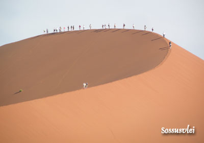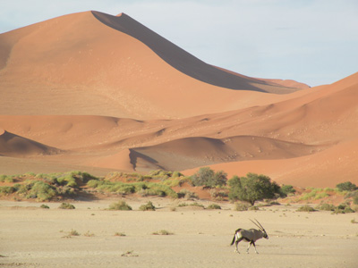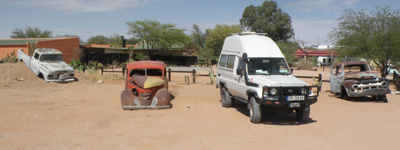 Dienstag, 17. November 9, Tag 3, Solitaire An Solitaire, das eigentlich nur aus einer Tankstelle, einem Laden und einer Bäckerei besteht, sollte man keineswegs vorbeifahren. Der Garten vor der Tankstelle ist mit alten Autokarosserien geschmückt, der Laden ist zugleich ein Museum und die Bäckerei ist ein Wahnsinn. Erstens gibt es den besten Kaffee, den wir in Namibia je getrunken haben, zweitens machen sie hier leckere Bäckereien und drittens ist der Chef selbst eine Sehenswürdigkeit. Nach kurzer Fahrt kommen wir nach Sesriem, wo wir für den Namib-Naukluft-Nationalpark 80 NAD (7,56 EUR) p.P. plus 10 NAD (0,95 EUR) für's Auto Eintritt bezahlen. Wir fahren zunächst zum nahen Viewpoint, von wo man einen netten Blick in den Sesriem-Canyon hat. Danach geht es auf Asphalt (!) ca. 60 Kilometer ins Sossusvlei, praktisch die einzige Region der Namib, die man befahren darf; das Verlassen der Straße ist selbstverständlich verboten. Nur die letzten vier Kilometer sind nicht asphaltiert, sondern sandig und ohne Allrad nur schwer passierbar. Wir sind zunächst die einzigen Besucher. Während Susi im Auto wartet, steige ich auf die Riesendüne (30 min), die angeblich über 200 Meter hoch ist. Von oben hat man einen tollen Blick auf das Vlei und die Nachbardünen. Der Sand ist heiß und bald glühen meine Alpinschlapfen und meine Füße. Der Abstieg diretissima geht in wenigen Minuten vonstatten. Wir verziehen uns nun an den Rand des Vleis und errichten unseren Nachtplatz. Während wir kochen, zieht eine Oryfamilie an uns vorbei. Für die zahlreichen Vögel stellen wir eine Tränke auf. Vor dem Sonnenuntergang erstrahlen die Dünen in kontrastreichem Rot, wunderschön. Während wir Essen heulen die Schakale. Km 194/486/28.670. |