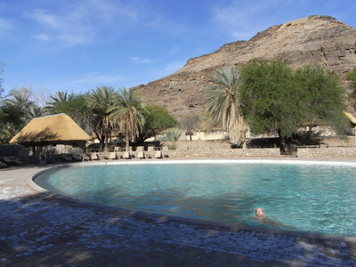 Donnerstag, 26. November 9, Tag 12, Fishriver-Canyon Unser erster Weg führt uns in Keetmanshoop in die Autoelektrik-Werkstätte. Nach einer kurzen (und wieder kostenlosen!) Überprüfung unserer Klimaanlage meint der Meister, es könnte der Regler kaputt sein, so einen hätte er aber nicht vorrätig und die nächste Toyota-Werkstätte sei in Springbock in Südafrika. Es könnte aber auch gut sein, dass die Klimaanlage auf Grund der gestrigen großen Hitze eine Notabschaltung gemacht hätte. Dann sollte sie heute wieder ohne Unterbrechung funktionieren. Jetzt am Vormittag ist es immerhin um gut 10 Grad "kühler" als gestern Nachmittag. Es geht also vorerst gekühlt weiter in Richtung Fishriver-Canyon. Wir wählen die Route über den Naute-Damm. Der Aussichtspunkt (S26 55.761 E17 56.225), an dem sich ein Kiosk befindet, ist eingezäunt und am Tor liest man die Eintrittspreise 3 NAD = 0,28 EUR p.P und 7 NAD = 0,66 EUR für's Auto. Aus Prinzip verschmähen wir die mit Steinen markierten Parkplätze in praller Sonne innerhalb der Umzäunung und lassen unseren Toyo draußen vor dem Tor in praller Sonne stehen. Wir gehen die 20 Meter zu Fuß rein, blicken auf Stausee und Staumauer und wundern uns, woher das viele Wasser wohl in diese Wüstenei gekommen ist. Unterhalb der Staumauer durchfahren wir auf einer Furt den Löwen-Fluss und passieren gleich darauf bewässerte Agrarflächen, wo Palmen, (Obst-?)Bäume und Wein gepflanzt sind. Wieder durch Wüste geht es nach Süden, die Bahngleise nach Grünau begleiten uns. Erstmals sehen wir in Namibia sogar einen fahrenden (Güter-)Zug. Dann verlassen wir die Bahnstrecke und kommen an der Grenze zum Ai-Ais-Nationalpark zum Canyon-Roadhouse, wo wir zu Mittag essen und das angeschlossene Automuseum bei freiem Eintritt besichtigen. Vor dem Fishriver-Canyon werden 170 NAD = 16 EUR (2P+1A, gültig 24 Stunden) für den Eintritt in den Nationalpark kassiert. Von mehreren Aussichtspunkten haben wir einen grandiosen Blick in den Canyon, der sich mäanderartig tief in die Ebene eingeschnitten hat. Dort und da glänzt eine größere Wasserfläche herauf, ansonsten ist er zur Zeit trocken. Als nächstes besuchen wir Ai-Ais, wo an der Stelle einer heißen Quelle ein Hotel mit Swimmingpool, Hallenbad und Campingplatz errichtet wurde. Auf der Terrasse vor dem Restaurant genehmigen wir uns ein Getränk, zu mehr hätte man bei der lahmen Bedienung und der mageren (Nachmittags-)Speisekarte ohnehin keine Lust. Wir gehen lieber in den Pool, wo das Wasser zwar sehr warm, aber doch ein klein wenig kühler als die Luft heraußen ist. Wenn man dann aus dem Wasser steigt, kühlt einen der Wind angenehm. Wir relaxen eine Weile auf gemütlichen Liegen, campieren dann aber außerhalb des Resort-Areals. Km 319/3.248/31.432. |