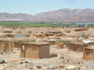 Freitag, 27. November 9, Tag 13, Oranje Durch eine schöne Wüstenlandschaft fahren wir nach Süden und erreichen den Oranje oder Orange-River, wie er auch genannt wird. Wir fahren an seinem Ufer nach Westen und werden beim Wiedereinfahren in den Ai-Ais-Nationalpark an einem Checkpoint registriert. Nach knapp 100 Kilometern Pistenfahrt kommen wir zum Park-Ausgang bei Sendlingdrif, wo zwei hübsche junge Damen wiederum unsere Ausfahrt festhalten. 100 Meter später würde man zur Fähre nach Südafrika abbiegen. Würde man, stünde da nicht ein Schild mit der Ausfahrt "Road closed". Wir schieben zu den beiden Hübschen zurück und fragen nach einer Umleitung. Wir erfahren, dass eigentlich nicht die Straße gesperrt ist, sondern die Fähre nicht verkehrt, weil der Oranje zu viel Wasser führt. Unglaublich, hat es doch schon lange nicht mehr geregnet. Wir fahren sicherheitshalber doch noch in die closed road und erfahren von Beamten des Grenzposten, dass die Fähre den Betrieb frühestens in einer Woche wieder aufnimmt. Wir sind echt sauer, denn das hätte man uns schon vor 100 Kilometern wissen lassen können. Es gibt also keine andere Möglichkeit als zurückfahren bis zur Kreuzung, wo wir den Oranje erreicht haben und dann weiter bis Nordoever und über den dortigen Grenzübergang. Zurück beim Parkeingangsposten schreibe ich, um nachfolgenden Reisenden den gleichen Ärger zu ersparen, auf den Wegweiser mit dickem Stift "Ferry at Sendlingdrif is closed!". Wir sind nicht nur 200 Kilometer umsonst gefahren, es fällt nun auch der Besuch des Richtersveld-Nationalparks aus, der von hier aus nur durch einen weiteren Umweg in einer Größenordnung von 150 Kilometern erreichbar wäre. Wir fahren also am Oranje weiter flussaufwärts und kommen bald an eine ungewöhnliche Anhäufung von Schilfhütten. Es ist ein riesiger Ort, Aussenkehr, vermutlich fast nur aus saisonal bewohnten Hütten bestehend. Hier leben hunderte (tausende?) Schwarze, die in den in der Nähe mittels künstlicher Bewässerung angelegten Weinfeldern arbeiten. Es gibt sogar eine Bank, vor der unzählige Menschen Schlange stehen. Es ist Freitag Mittag und anscheinend ist die Lohnauszahlung im Gange. Riesige Schlangen auch vor einem großen Spar-Supermarkt. Hier wird das Geld gleich wieder ausgegebeben. Ein paar Kilometer weiter entsteht inmitten von Weinfeldern, direkt am Orange-River das Norotshama-Resort (S28 23.637 E17 24.648). Es trifft sich gut, dass das Restaurant schon in Betrieb ist und eiskalte Biere und saftige Steaks serviert. Wir sitzen auf einer schattigen Terrasse mit Blick auf den Fluss mit seinen Pelikanen. Bald nach dem Mittagessen ist Nordoever erreicht, wo der Grenzübertritt schnell und unkompliziert erfolgt. Es wird nicht einmal die Road-Tax überprüft. |