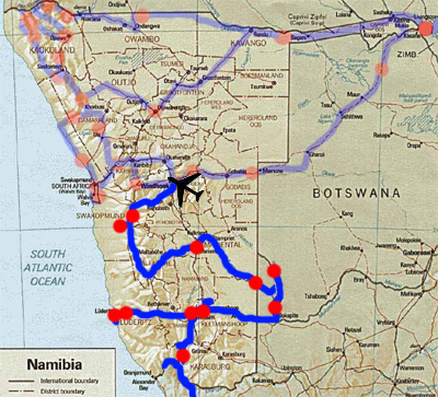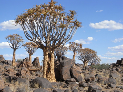 Auch auf namibischer Seite sind Immigration- und Polizei-Kontrolle schnell erledigt. Die Road-Tax (Cross-Border-Charge) zahlt man erst ca. 35 km nach der Grenze in Aroab, einem verschlafenen Dorf, in dem außer dem Office heute am Sonntag alles zu hat. Ab der Grenze ist nicht mehr asphaltiert, aber die Piste, die durch schöne Wüstenlandschaft führt, ist in bestem Zustand. In Keetmanshoop essen wir in der Central Lodge (S26 34.644 E18 08.014) hervorragend zu Mittag und fahren dann ca. 40 Kilometer aus der Stadt Richtung Nordosten, um einen der Köcherbaumwälder und einen Giant's Playground anzusehen. Beides gibt es im auf privatem Gelände gelegenen Mesosaurus Park (S26 24.366 E18 28.596) zu sehen. Der Farmer führt uns für 100 NAD = 9,45 EUR p.P. durch sein Gelände. Zunächst zeigt er uns das Grab eines 1904 gefallenen Schutztruppensoldaten und anschließend hier gefundene Fossilien. Ein Stück weiter gibt es eine beeindruckende Ansammlung der markanten Köcherbäume, eine Art der Aloe, die große Mengen Wasser in den Stämmen und Ästen speichern und daher mehrere Jahre ohne Regen überdauern kann. Die Bäume befinden sich in einem Gelände, in dem Felsstücke herumliegen, teilweise wie Spielzeug aufgetürmt. Auf einem kleinen Felsturm spielt der Farmer wie auf einem Xylophon ein Lied und lässt uns dann hier zurück und wir können beliebig lange zwischen Felsen und Bäumen klettern. Da es jedoch knapp 40 Grad hat und die Felsen die Hitze auf grausame Art reflektieren, fahren wir bald zurück nach Keetmanshoop, um im Canyon-Hotel (S26 35.002 E18 8.237')das Internet-Cafe zu benützen. Anschließend schlagen wir in Lafenis Restcamp unser Nachtlager auf (S26 36.759 E18 09.977, 150 NAD = 14 EUR für A+2P). Das Camp ist sauber und beherbergt ein hervorragendes Restaurant (allerdings mit langer Wartezeit auf das Futter) und ein stimmungsvolles Pub. Bei Sonnenuntergang hat es übrigens noch immer 36 Grad und erst in den frühen Morgenstunden kühlt es ein wenig ab. Trotz offener Dachluke schwitzen wir mächtig und wegen selbiger haben einige sehr lästige Mücken den Weg zu uns gefunden. Km 449/2.096/30.280. |