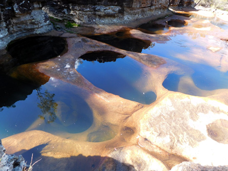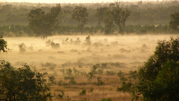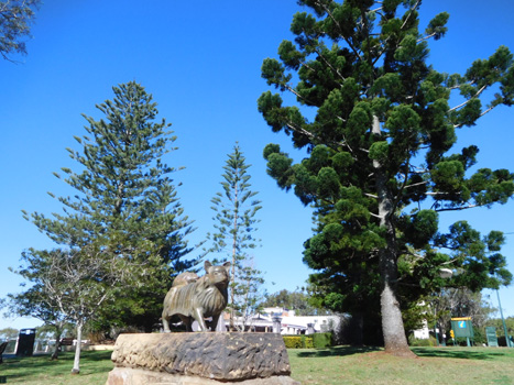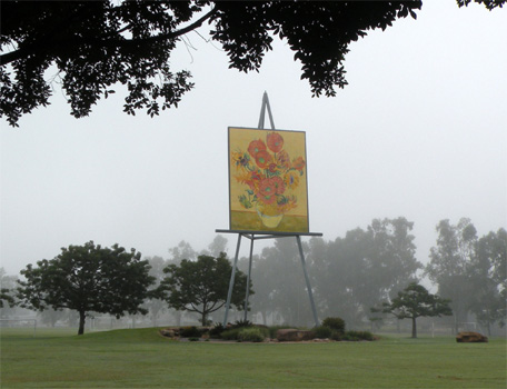 Das angeblich größte Gemälde der südlichen Hemisphäre, eine Kopie eines Vincent Van Gogh-Blumenbildes im Park von Emerald, erstrahlt leider nicht in der Morgensonne, sondern liegt im Nebel. In Emerald können wir zusehen, wie im Tagbau gewonnene Kohle auf unendlich lange Güterzüge verladen wird, um zur Küste gebracht zu werden (Australien ist der weltweit größte Kohleexporteur). Wir machen einen Abstecher in den Blackdown-Tableland-Nationalpark, der sich auf einem 600 Meter hohen Plateau befindet. Die laut Reiseführer abenteuerliche Auffahrt ist entschärft, weil asphaltiert. Von oben genießt man einen schönen Blick über die Ebene darunter. Hier gibt es Nadelbäume, die an Föhren erinnern, darunter aber Palmen und Farne. Im Zentrum des Parks fließt ein Bach, dessen Wasser im Lauf der Zeit kreisrunde Löcher in den Sandstein gebohrt hat: Potholes. Ein sehr schöner Platz! Vor Rockhampton biegen wir nach Süden ab und übernachten in Theodore auf einem schön an einem Fluss gelegenen Gratis-Campingplatz. Km 534/7.567/69.957.