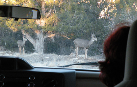 Wir sind krank. Susi hat gestern schon gehustet und war schon beim Arzt, ich habe Halsschmerzen und beide fühlen wir uns elend. Wir bleiben eine Stunde länger liegen und beschließen beim Frühstück, gemütlich durch den Red Canyon Richtung Bryce Canyon zu fahren. Das war eine gute Idee, stellt sich später heraus, da man den Canyon ohne viel Herumlaufen von verschiedenen Aussichtspunkten überblicken kann, die man gut mit dem Auto erreichen kann. Auf Grund der Seehöhe von über 2.500 Metern ist es so kalt, dass wir ziemlich unser ganzes Gewand anziehen müssen, um nicht zu frieren. Der Canyon besticht durch unzählige Sandsteintürmchen und -pyramiden, die die Erosion übrig gelassen hat. Im ziemlich einzig offenen Restaurant nehmen wir ein verspätetes Mittagessen ein. Man wünscht freundlich Happy Thanksgiving und teilt uns mit, dass wegen dem Feiertag die nicht alkoholischen Getränke im Buffetpreis inbegriffen sind, dafür kostet das Buffet heute statt 11,95 stolze 18,95 Dollar. Plus Steuer und obligatem Trinkgeld versteht sich. Am Nachmittag sind wir auf der Rückfahrt ziemlich alleine auf der Straße. Wahrscheinlich sitzen schon alle im Kreise der Familie beim Truthahn. Bei uns gab's doch mal die Polizistenatrappen. In Amerika ist alles ein bisschen größer, hier gibt es Polizeiautos mit Sheriff drin als Atrappe. Vor dem Zion-Nationalpark machen wir früh Halt, wir wollen uns ja auskurieren. Susi hat auf der Rückfahrt ohnehin schon die meiste Zeit geschlafen, ich fühle mich besser, aber auch noch müde. In der Dämmerung grasen eine Hirschkuh und ihr Junges direkt vor dem Womo. Mi 172/1.130.