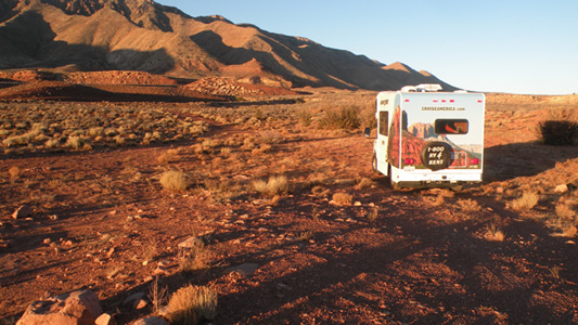 Auf der Interstate 15 gelangen wir zurück nach Las Vegas, wo wir unsere Vorräte ergänzen. Praktischer Weise haben alle Supermärkte auch am Sonntag offen. Wir sehen uns den zirka 30 Meilen südöstlich von Vegas gelegenen gewaltigen Hoover-Dam mit seiner 223 Meter hohen Staumauer an, die den Colorado-River zum Lake Mead aufstaut. Von der neuen Brücke hat man einen tollen Blick auf den Staudamm. Hier verlassen wir Nevada und kommen nach Arizona. Die Fahrt Richtung Grand Canyon über Kingman und Williams führt durch tolle Prärielandschaften, die noch toller wären, wäre nicht der Highway. Doch ohne diesen kämen wir noch langsamer voran. Es ist auch auf dem Highway mühsam: Erlaubte Höchstgeschwindigkeit ist 75 mph, knapp 120 km/h. Da geht halt nichts weiter. Wir übernachten auf einem Platz neben der Zufahrtsstraße zum Grand Canyon. Die Nacht ist eiskalt, dafür hat sich das Problem mit der Heizung von selbst ein wenig entschärft. Da wir wild campieren und nicht an eine externe Stromversorgung angeschlossen ist, funktioniert die ultralaute Lüftung der Klimaanlage nicht. So können wir doch ein wenig einheizen, bis der Heizungslüfter irgendwann die Batterie ausgeleert haben wird. Mi 349/479.