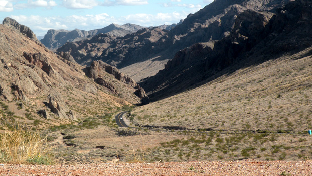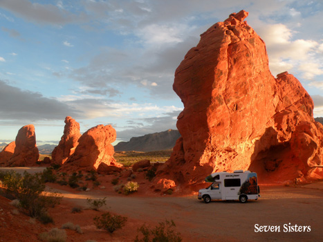 Auf der Interstate 15 verlassen wir die Stadt nach Norden und fahren im Nu durch die Wüste Nevadas. Unser Ziel ist das Valley of Fire, in dem verschiedenfarbige Gesteinsformationen ein spektakuläres Bild bieten. Am Atlatl Rock gibt es Felsgravuren zu sehen, die aber bei weitem nicht so beeindruckend sind, wie die in Nordafrika gesehenen. Besonderes Highlight ist "The Fire Wave", eine gestreifte Sandsteinwelle, die ich nach einem 20-minütigen Geländemarsch erreiche. Auf der Weiterfahrt leuchten die Felsen rot in der Abendsonne, was dem Tal seinen Namen gibt. Kurz vor Overton übernachten wir in den Poverty Hills. Auf dem weitläufigen Areal stehen verstreut gut 20 RV's. Mi 95/130.