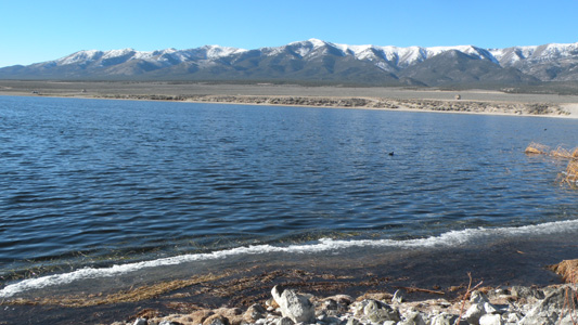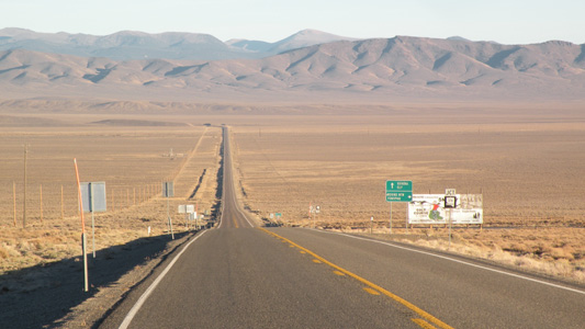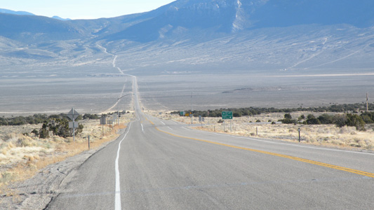 Wir fahren nun auf dem US-Highway 50 "The Loneliest Road in America" Richtung Westen quer durch die Wüste Nevadas. Die Straße wird durchaus ihrem Namen gerecht: Etwa alle zehn bis fünfzehn Meilen kommt uns ein Auto entgegen, alle 70 bis 100 Meilen passieren wir ein Kaff. Nur die Wüste enttäuscht uns völlig. Wie auch schon gestern fahren wir durch riesige Ebenen, die im Süd-Nord-Verlauf endlos scheinen, in Ost-West-Richtung ca. alle 20 bis 30 Meilen von einem quer verlaufenden Gebirge unterbrochen werden. Außer der Straße und einem Zaun zu beiden Seiten gibt es eigentlich nichts, keine Häuser, keine Bäume. Und alles völlig flach. Und dennoch keine Wüste. Denn alles ist bedeckt von einem dichten waden- bis kniehohen Gras- und Buschbewuchs. Am Nachmittag machen wir eine längere Pause und sitzen auf unseren Klappstühlen bei einem Kaffee genüsslich in der Sonne. Mi 257/1.596.