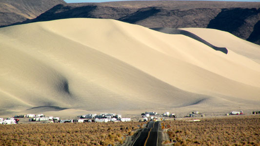 Weiter geht es auf der einsamsten Straße Amerikas. Auf den nächsten 150 Meilen - soweit reicht unser Sprit noch - sind auf der Karte nur drei Orte eingezeichnet: Cold Springs, hier gibt es nur ein Motel, Middle Gate ist eine Raststätte, die Gas-Food-Ice bietet und erst Fallon ist eine richtige Stadt mit allem Drum und Dran. Vor Fallon gibt es dann auch ein Stück echte Wüste, also Landschaft ohne Bewuchs. Sogar eine Sanddüne haben sie hier. Ist zwar nur eine, dafür riesengroß. Am Fuße der Düne campieren massenhaft Motorsportler, die mit Moto-Cross-Maschinen und Quads die Düne rauf und runter fahren. Der Lärm ist unglaublich. Bald ist es dann aus mit der Einsamkeit auf dem Highway, Reno naht. Wir machen eine Stadtrundfahrt. Auch hier gibt es massenhaft Casinos, doch nicht in der Giganz von Las Vegas. Unser nächstes Ziel ist Virginia City, bekannt aus verschiedenen Western, vor allem aus der Serie "Bonanza". Hier, scheint es, sind die Uhren seit 150 Jahren stehen geblieben, zumindest was die Gebäude im Stadtzentrum betrifft. Natürlich sind vor den Shops und Saloons nicht Pferde angebunden, sondern Autos geparkt, aber man hat sofort das Gefühl, in eine andere Zeit versetzt zu sein. Die Häuser an der Hauptstraße sind restauriert oder originalgetreu wieder aufgebaut, der Gehsteig besteht aus Holzbrettern. Und immer wieder laufen Leute herum, die einem Western entsprungen zu sein scheinen und die so tun, als würden sie gar nicht bemerken, dass sie sich in der falschen Zeit befinden. Sind das vom Tourismusverband bezahlte Schauspieler? Erst in einem Saloon, in dem eine Band Live-Musik spielt und elegante Herren mit breitkrempigen Hüten und Revolvergürtel unter dem Mantel mit chicen Damen tanzen, wird uns klar, dass es sich um Country- und Westernfans aus Reno oder anderswo handelt, die hierher fahren, um einen Tag in "ihrer" Zeit zu verbringen. Wir sind begeistert von der Stadt und vor allem von ihren Fans. Durch Carson City, der unscheinbaren Hauptstadt Nevadas, geht es weiter auf dem nun gar nicht mehr einsamen Highway 50 an den Lake Tahoe, an dessen Ufer sich eine Luxusvilla an die andere reiht. In den umgebenden Wäldern befinden sich hunterte chice Wochenendhäuser und entlang der Straße eine kaum enden wollende Konsummeile mit Lokalen, Shops und bis zur Grenze zu California auch Casinos. In einer endlosen Kolonne - der Wochenendrückreiseverkehr nach Sacramento ist voll im Gange - fahren wir die Siera Nevada in unzähligen Kurven hinunter und erst als es wieder halbwegs eben ist, finden wir einen Nachtplatz etwas abseits. Mi 267/1.863.