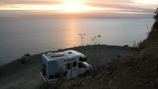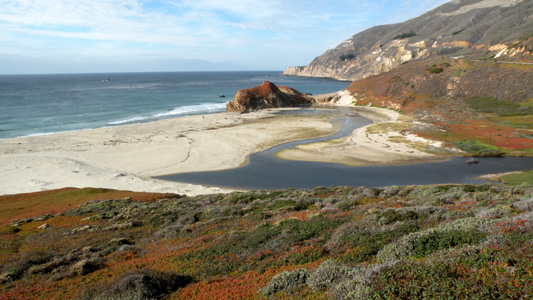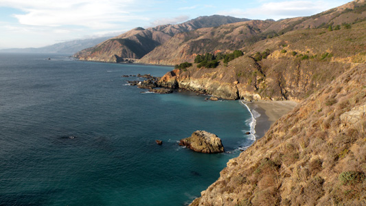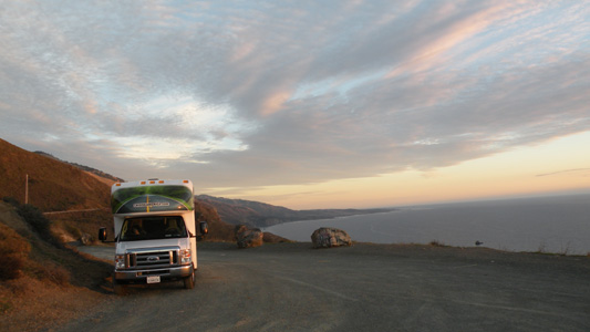 Auf dem Highway Nr. 1 geht es zunächst nach Santa Cruz. Die Stadt, die bekannt ist für ihren Vergnügungspark direkt am Strand, befindet sich schon im Winterschlaf. Zudem ist von Sonne keine Spur zu sehen und es weht ein kalter Wind, sodass unser Spaziergang recht kurz ausfällt. Auch in Monterey und Carmel halten wir uns nur kurz auf. Die Küste ist anfangs flach und die Straße führt durch Felder, die bis ans Meer reichen. Ab Carmel werden die Sandstrände schmäler um später ganz zu schwinden und einer Steilküste zu weichen, in die die Küstenstraße in den 30er-Jahren gebaut wurde. Über -zig Meilen ist die Strecke atemberaubend und von zahlreichen Aussichtsplätzen tun sich spektakuläre Ausblicke auf. Immer wieder müssen wir halten, um die großartigen Panoramen zu genießen. Am Nachmittag wird das Wetter besser und wir sitzen sogar eine Weile in der Sonne. Kurz vor Sonnenuntergang finden wir einen tollen Nachtplatz zirka 200 Meter über dem Meer. Mi 169/2.248.