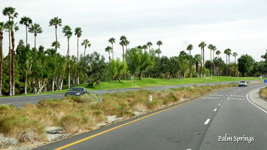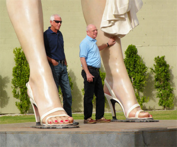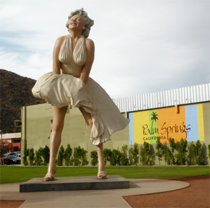 Trotz Straßenlärm schlafen wir bis 8 Uhr. Das Wetter ist noch schlechter als gestern: Es schüttet aus Wolken, die der Stadt praktisch aufliegen, die Hochhäuser sind Wolkenkratzer im wahrsten Sinne des Wortes. Wir sehen daher nicht den berühmten HOLLYWOOD-Schriftzug auf den Hügeln der Stadt. Wir fahren eine Runde durch das Zentrum und verlassen dann L.A. nach Osten, weg von der Küste und hoffentlich weg vom Schlechtwetter. Und wirklich: Auf halbem Weg nach Palm Springs scheint erstmals kurz die Sonne, in Palm Springs ist das Wetter schön, wenngleich dunkle Wolken in der Ferne in Sicht sind. Palm Springs ist eine in der Wüste künstlich reichlich begrünte Stadt, in der jeder, der in Los Angeles eine Luxusvilla hat, eine Zweit-Luxusvilla hat. Die kurze Hose wird ausgepackt und erstmals die Klimaanlage im Auto in Betrieb genommen. Im Zentrum der Stadt lüftet eine riesige Merylin-Monroe-Statue das Geheimnis, was denn die berühmte Blondine unter dem Kleid trägt. Nördlich der Stadt liegt die Thausand-Palms-Oasis, durch die wir einen Spaziergang machen, bevor wir noch ein Stück Richtung Joshua-Tree-Nationalpark fahren. Mi 169/2.698.