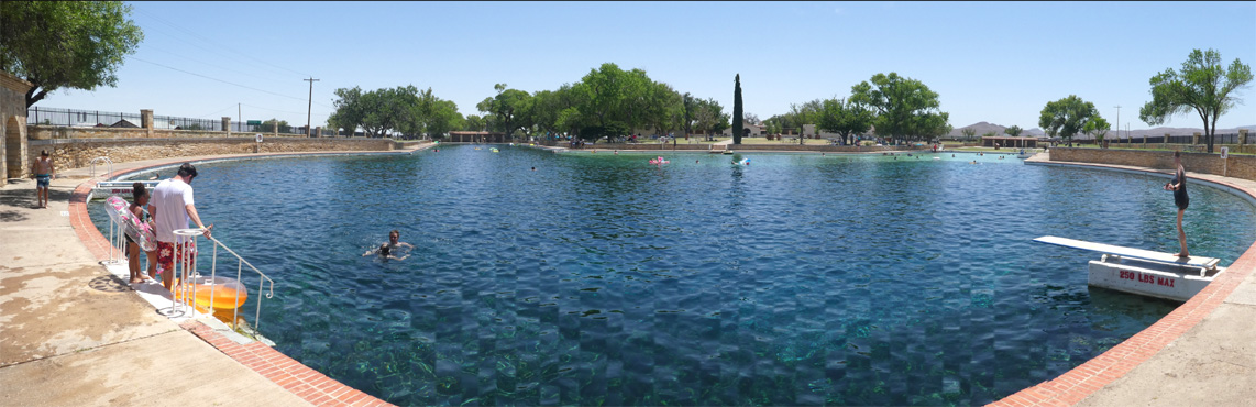 Leider ist das McDonald Observatory, das größte Teleskop der Welt, zur Zeit für Besucher geschlossen. Das hätten wir uns gerne angesehen, aber auch aus der Ferne (man kommt nicht einmal in die Nähe) ist der riesige Teleskopturm auf dem Mount Locke beeindruckend. In Fort Davis sehen wir uns das teilweise restaurierte Fort von 1850 an. Mehrere Gebäude sind möbliert und man erhält einen guten Eindruck vom damaligen Leben hier. In Balmorhea befindet sich der mit 4.000 m2 größte quellengespeiste Pool der USA. Das Wasser weist ganzjährig eine Temperatur von 24 Grad auf und ein Bad hier ist echt eine tolle Abkühlung. Es gibt massenhaft kleine Fische, die an einem knabbern und auch Schildkröten sollen hier leben. Im Schatten von Bäumen essen wir zu Mittag, lesen und kühlen uns immer wieder im Pool ab, bis ein Wind aufkommt, der so heiß ist, dass es auf der Haut brennt. Wieder hat es 43 Grad! Es ist Zeit für die Weiterfahrt, wir steuern die Huecla Tanks, eine etwa 50 Kilometer vor El Paso gelegene Oase in der wüstenartigen Landschaft, an. Leider ist der Campingplatz in der Oase voll (und bis Ende Juli ausreserviert), also übernachten wir direkt vor dem Gate des Parks. Die zweieinhalb Stunden vor Sonnenuntergang sind noch eine heiße Sache, denn der einzige Schatten, in den wir uns verkriechen können, ist der des Zerberus. Etwa 100 Kilometer vor El Paso haben wir die Zeitzonengrenze überfahren, wir haben jetzt US-Mountain Time und sind nun acht Stunden hinter Mitteleuropa. Km 404/5.348/148.964.