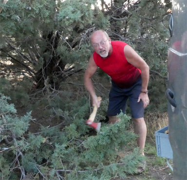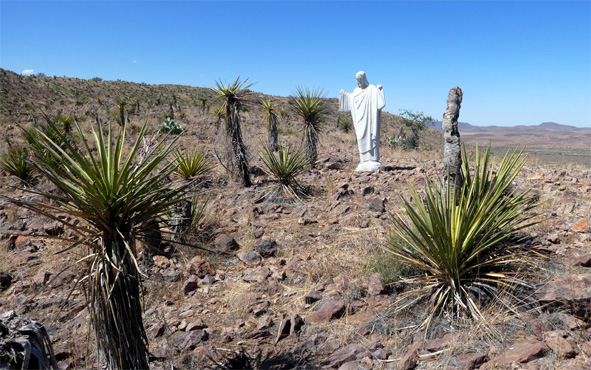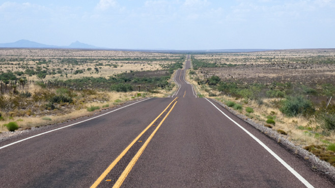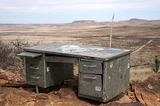 Hunderte, wenn nicht tausende von Ölpumpen arbeiten beidseits des Highways. Später weicht das öde und flache Buschland öder und flacher Prärie. Alles Land ist eingezäunt. Zwar erreicht das Thermometer heute Mittag nur mehr 36 Grad, wir beschließen aber dennoch, nicht den für seine spezielle Hitze bekannten Big Bend Nationalpark am Rio Grande zu besuchen, sondern via Alpine und die Davis Mountains nach El Paso zu fahren. Dem Städtchen Alpine mache ich meine Aufwartung mit einer Bergtour. Zwar darf man sich bei 39 Grad natürlich nicht allzuviel vornehmen, aber der Hancock Hill mit etwa 200 Höhenmetern geht problemlos. Der Berg ist bekannt, weil ein Schreibtisch auf seinem Gipfel steht. Alle Städte und Orte, die wir durchfahren sind praktisch menschenleer. Man sieht nur Autos. Jeder fährt von einem klimatisierten Gebäude in einem klimatisierten Auto zu einem anderen klimatisierten Gebäude. Die unzähligen Campingplätze und RV-Parks (RV heißen hier die Wohnmobile) haben keinen Schatten. Das ist auch nicht notwendig, weil die riesigen Wohnmobile und -anhänger an die Steckdose gehängt werden und klimatisiert sind. Und keiner geht raus. Da die Klimaanlage des Zerberus ja nur während der Fahrt arbeitet (bei dieser Hitze nicht einmal das recht zuverlässig), sollten unsere Nachtplätze idealerweise schattig sein. In Mafra werden wir von der Polizei angehalten und abgemahnt, weil der vermeintlich rechte Fahrstreifen, auf dem ich fahre, zum Parken gedacht ist und nicht zum drauf fahren. Über die Texas Mountain Road wollen wir zu den Observatorien am Mount Locke. Doch auf gut 1.600 Metern Seehöhe will der Zerberus nicht mehr. Bei der Bergauffahrt mit wenig Fahrtwind bei 36 Grad überhitzt der Motor. Wir lassen ihn abkühlen und fahren ein paar Kilometer bis zu einem Rastplatz zurück. Nachdem ich ein paar Äste eines Nadelgehölzes abgehackt habe (Hacke und Säge sind natürlich auf einer Weltreise mit an Bord), können wir im Schatten parken. Zum Abendessen gibt es Bratwürste (scharf und mit Reis drin) mit Sauerkraut aus der Dose. Km 517/4.944/148.560.