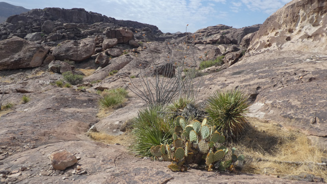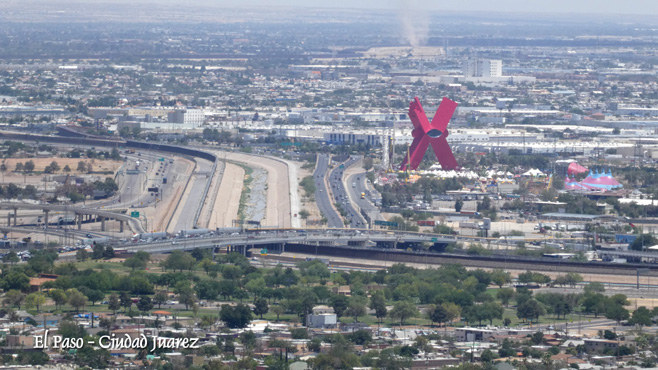 Wir sehen uns den Huecla Tanks State Park an. Hier haben sich in den Felsen Mulden gebildet, in denen das Regenwasser stehenbleibt und mit der Zeit Gras, Palmen und Kakteen gewachsen sind. Manche der Felsenberge lassen sich erklettern, stellenweise sind Ketten gespannt. Zu allen Zeiten haben sich an Felsvorsprüngen Menschen mit Malereien und Gravuren verewigt. Manche Felsbilder sollen mehrere tausend Jahre alt sein, andere sind sehr viel jünger, MF Wayland etwa war 1884 hier. Auf dem Foto beachte man das weiße sich aufbäumende Pferd. El Paso, die westlichste Stadt Texas', am Rio Grande und somit direkt an der Grenze zu Mexiko gelegen, ist riesig. Von der Rim-Road, einer Aussichtsstraße an den Hängen des Mount Wyler, sieht man die enorme Ausdehnung. Die Stadt ist trotz der Grenze mit ihrer mexikanischen Nachbarstadt Ciudad Juarez (übrigens die Stadt mit der höchsten Mordrate Mexikos, 2.000 Morde jährlich!) zusammengewachsen. Die Ausfahrt aus El Paso führt über einen Bergrücken und prompt überhitzt der Motor wieder. Während wir warten, bis er abkühlt, schaue ich mal unter die Motorhaube, ob eh der Kühlerventilator läuft, und ich traue meinen Augen nicht. Wenn ich das nicht mit eigenen Augen sehen würde, diese Geschichte würde ich niemals glauben: Es ist jetzt nicht so, dass der Ventilator nicht läuft, sondern er ist einfach nicht da. Er fehlt. Ich kann mir weder vorstellen, dass der so kaputt gegangen ist, dass gar nichts mehr von ihm da ist, noch, dass er in einer Werkstätte aus- und nicht wieder eingebaut wurde. Jedenfalls sollten wir so ein Teil rasch besorgen, denn auch auf den nächsten Bergauffahrten benötigen wir Abkühlpausen. Es hat zwar nicht mehr über 40 Grad, aber 38 allemal.