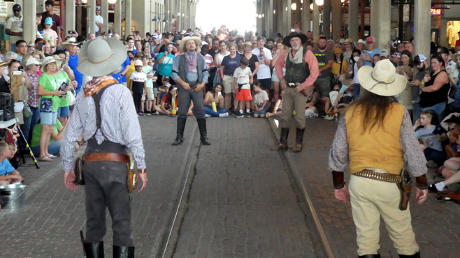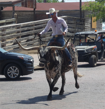 Fort Worth ist die mit Dallas zusammengewachsene Nachbarstadt. Auch hier gibt es Rinder zu sehen, aber nicht aus Bronze, sondern echt: Zwei Mal täglich wird eine Herde Langhornrinder die Straße vor der Live Stock Exchange, der Rinderbörse, entlanggetrieben. Die Tiere mit ihren enorm langen und im Bogen abstehenden Hörnern sind echt imposant. Ein kleines Museum wartet mit Kuriositäten auf, wie dem Unglück bringenden Brautkleid oder einer Glühbirne, die schon seit über hundert Jahren brennt. Auf dem Rückweg zum Auto geraten wir unversehens in eine Schießerei, in der der Sheriff zwei gesetzlose Banditen abknallt. Wir sehen uns noch das Fort Worth Museum of Arts an, das unter anderem mit Werken von Picasso, Miro, Monet und Manet glänzt und außerdem das erste Gemälde von Michelangelo zeigt. Nun geht es weiter westwärts, bis El Paso an der mexikanischen Grenze sind es über tausend Kilometer. Je nach Temperatur wollen wir uns eventuell den südöstlich von Paso liegenden Big Bend Nationalpark ansehen. Heute Nachmittag messen wir 43 Grad und es ist im Freien kaum auszuhalten, denn kaum wo gibt es Schatten. Als wir im Lake Colorado City State Park campieren, hat es eine Stunde vor Sonnenuntergang noch immer 40 Grad, aber jetzt, wo die direkte Sonneneinstrahlung weg ist, finden wir es angenehm. Wenn man übrigens kein warmes Bier mag und es auch nicht auf einmal austrinken will, muss man es nach jedem Schluck zurück in den Kühlschrank stellen, weil es so schnell warm wird. Km 470/4.427/148.043.