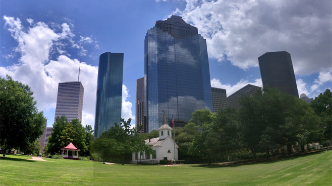 Die Nacht war echt heiß, in der Früh zeigt das Thermometer im Zerberus 29 Grad. Draußen hat es 24, aber in der Nacht alle Türen offen lassen, ist in einer Großstadt zu gefährlich, eine Hecktür und natürlich die Dachluken hatten wir eh offen. Heute ist Kulturtag. Als erstes sehen wir uns die Rothko Chapel an, eine berühmte konfessionslose Kapelle die zum Meditieren einladen soll. In dem schwach beleuchteten achteckigen Raum hängen an den Wänden riesige (einfärbig) schwarze Bilder. Schwarz gekleidetes Personal passt auf, dass niemand auch nur einen Muckser macht. Nachdem wir unsere Meditation abgeschlossen haben, besuchen wir die nur ein paar Schritte weiter gelegene Menil Collection, eine weltweit bedeutende private Kunstsammlung. Besonders gefallen uns die Werke René Magrittes und die große Sammlung antiker afrikanischer Stammeskunst. Nächste Station ist das Freilichtmuseum im Sam Houston Park, wo man vor den Wolkenkratzern Houstons alte Häuser und eine Kirche wiederaufgebaut hat. Immer im Frühjahr findet in Houston die Art Car Parade (den Begriff sollte man unbedingt googeln, Bildersuche!) statt, bei der total schräge Autos durch die Stadt fahren. Einige wenige davon kann man im winzigen Art Car Museum bewundern. Wieder auf der I-10 geht es weiter westwärts. Heute ist es mit 39 Grad so heiß, dass wir viel Zeit für die Suche eines schattigen Nachtplatzes aufwenden. Wir übernachten in McQueeney, einem Ort 50 Kilometer vor San Antonio in einer Wohnsiedlung, wo wir am Straßenrand unter Bäumen stehen dürfen. Km 300/3.322/146.938.