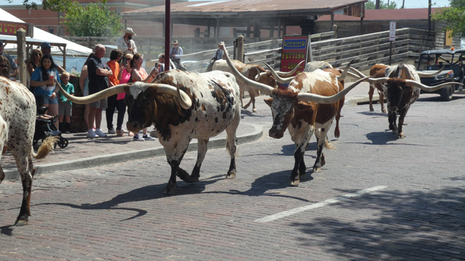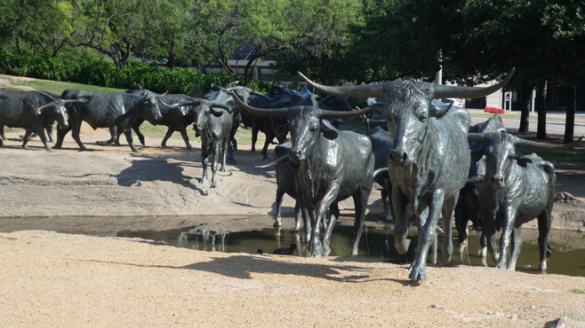 Zu Mittag sind wir in Dallas. Die goldglänzenden Hochhäuser, die man aus dem Fernsehen kennt, gibt es wirklich. Wir sehen uns ein Freilichtmuseum an, dessen Häuser man auch innen besichtigen kann, und die mit reichlich altem Inventar aufwarten, statten der kleinen Crow Collection of Asian Art und dem Dallas Museum of Art einen Besuch ab und sehen uns an der Pioneer Plaza den mit 40 überlebensgroßen Langhornrinderstatuen aus Bronze dargestellten Viehtrieb an. Mit guten Nachtplätzen sieht es schwierig aus, wir übernachten auf einem Parkplatz, wo sich leider nach Einbruch der Dunkelheit junge Leute einen Wettstreit an lauter Musik aus dem Autoradio liefern. Km 366/3.957/147.573.