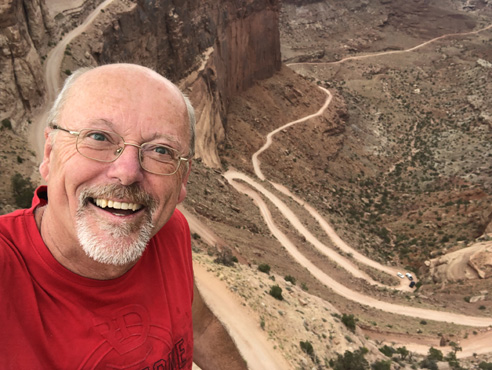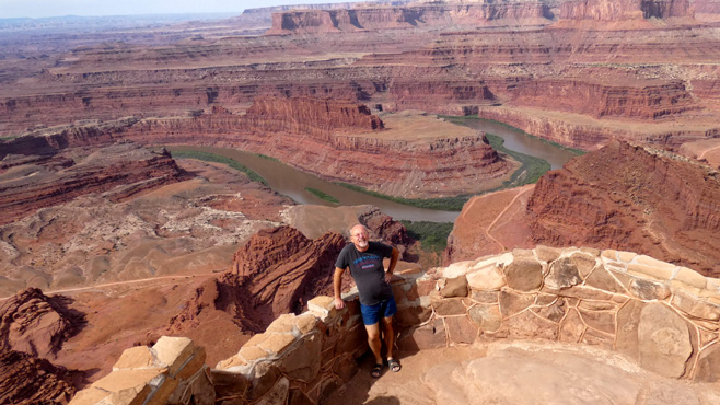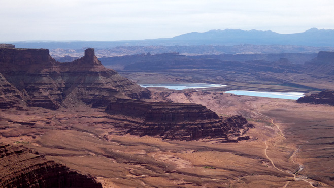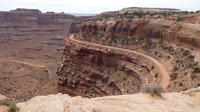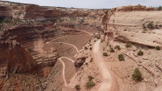 In die Ebene, auf der wir uns befinden, hat der mäandernde Colorado River tiefe Canyons eingeschnitten. Der Deadhorse Point liegt auf dem spitz zulaufenden Ende eines Ausläufers der Hochebene. Von hier hat man einen spektakulären Blick nach drei Seiten in die Tiefebene und die Canyons darin. Ein paar Meilen weiter befindet sich das Gate des Canyonland Nationalparks. Der Name sagt schon alles. Von unzähligen Aussichtspunkten hat man fantastische Ausblicke in die Canyons des Colorado Rivers und seiner Nebenflüsse. An einer Stelle sieht man beim Blick in die Tiefe, dass in den fast senkrechten Wänden des 400 Meter (!) tiefen Canyons eine Piste nach unten verläuft und in der Tiefebene am Horizont verschwindet. Wir machen uns schlau und erfahren, dass die Piste Shafer Trail Road heißt, nach 72 Kilometern Moab, eine kleine Stadt, erreicht und mit Allradfahrzeugen befahren werden darf. Also nichts wie runter! Die Piste ist sehr steinig und stellenweise sehr steil. Während wir uns langsam in die Tiefe arbeiten, fragen wir uns, wie ein Mensch auf die Idee kommen kann, in diese Steilwand eine Straße zu bauen. Ein paar Geländewagen kommen uns entgegen, es gibt Ausweichen. Nach einer halben Stunde sind wir unten, die Piste führt den Colorado River entlang und bleibt weiter steinig. Nach einer Stunde haben wir zwölf Kilomter geschafft, nach zwei Stunden und 28 Kilometern erreichen wir das Pottasche-Werk, das wir von oben in der Ferne gesehen haben. Kurz darauf ist die Straße asphaltiert und wir sind im Nu nahe an Moab, wo wir direkt am Colorado River übernachten. Km 186/8.538/152.154.